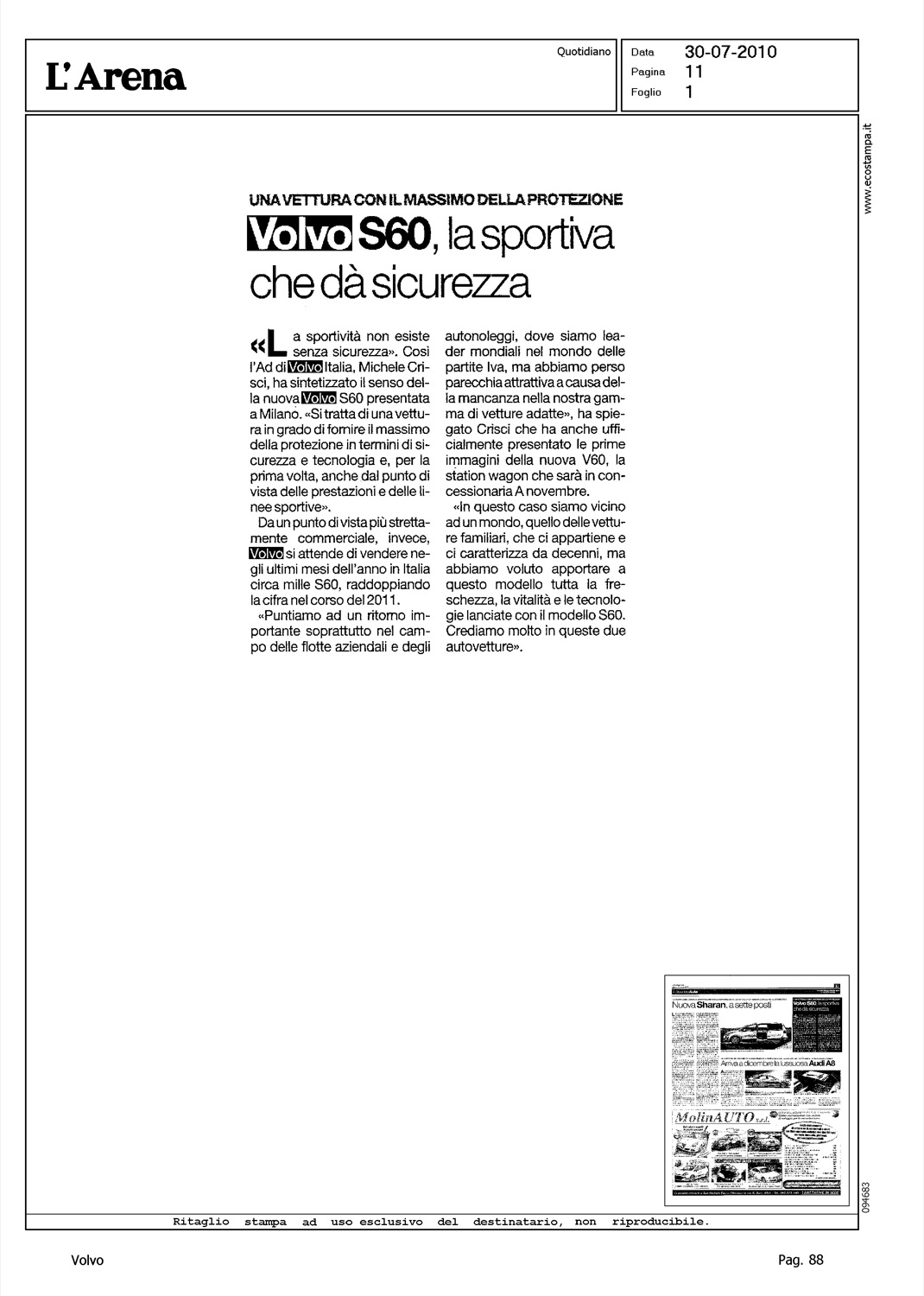Author: Line: S60 Model: Linea S60 Testdrive Subject: - Title: VOLVO S60, LA SPORTIVA CHE DA' SICUREZZAHighlight: MILANO - CRISCI SU S60 E MERCATO - V60