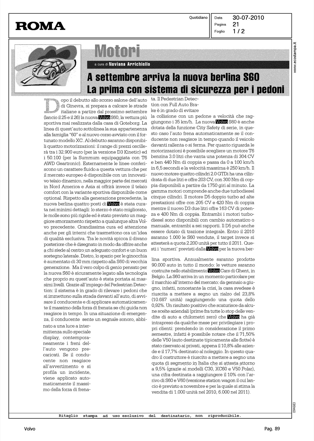 Title: MOTORI - A SETTEMBRE ARRIVA LA NUOVA BERLINA S60 - LA PRIMA CON SISTEMA DI SICUREZZA PER I PEDONI