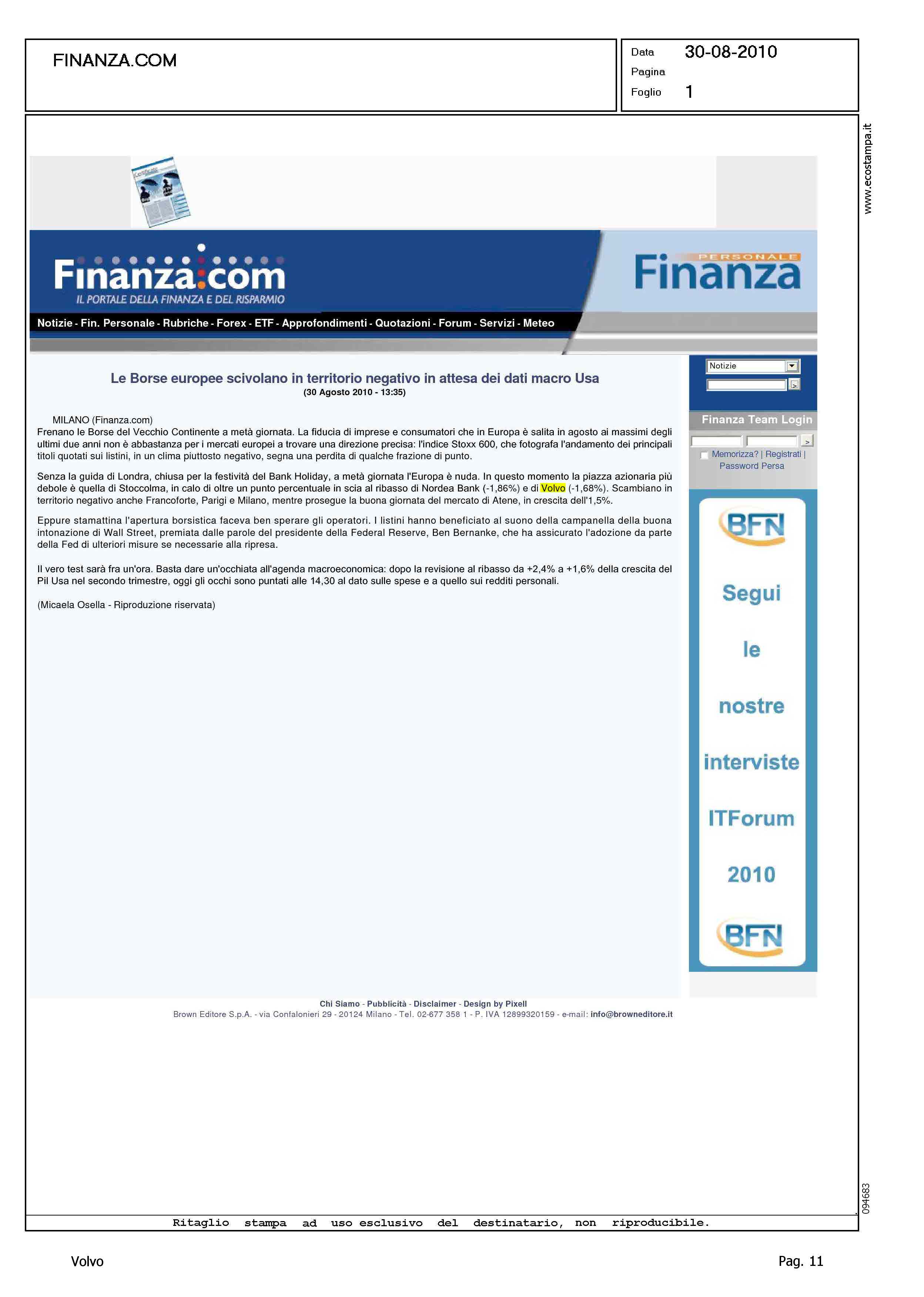 Author: Line: Corporate Model: Corporate Subject: - Title: LE BORSE EUROPEE SCIVOLANO IN TERRITORIO NEGATIVO IN ATTESA DEI DATI MACRO USAHighlight: QUOTAZIONE BORSA AZIONE VOLVO