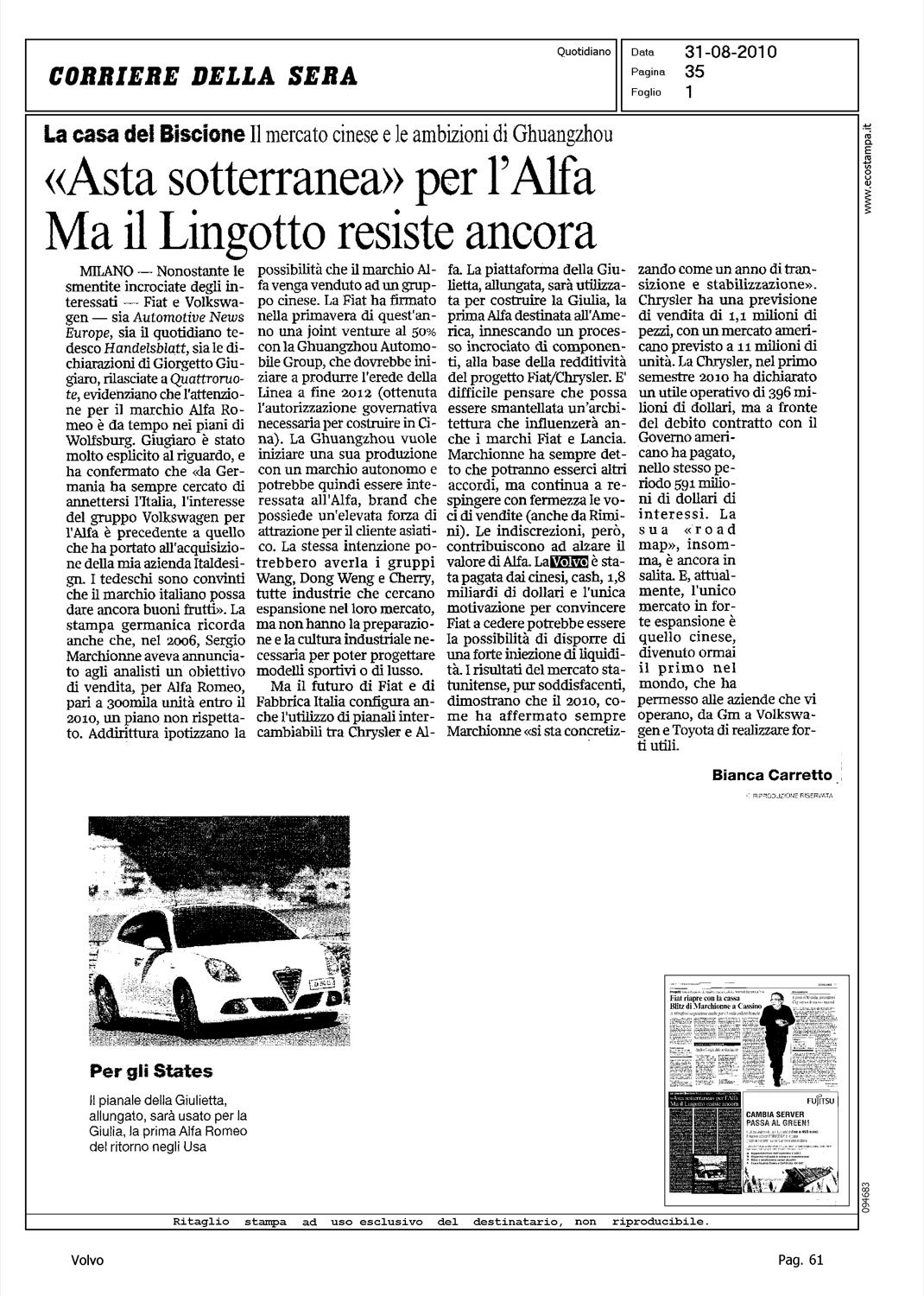Author: CARRETTO, BIANCALine: Corporate Model: Corporate Subject: - Title: "ASTA SOTTERRANEA" PER L'ALFA - MA IL LINGOTTO RESISTE ANCORAHighlight: CITAZIONE, ARTICOLO MERCATO CINESE, IPOTESI ALFA ROMEO A GRUPPO CINESE