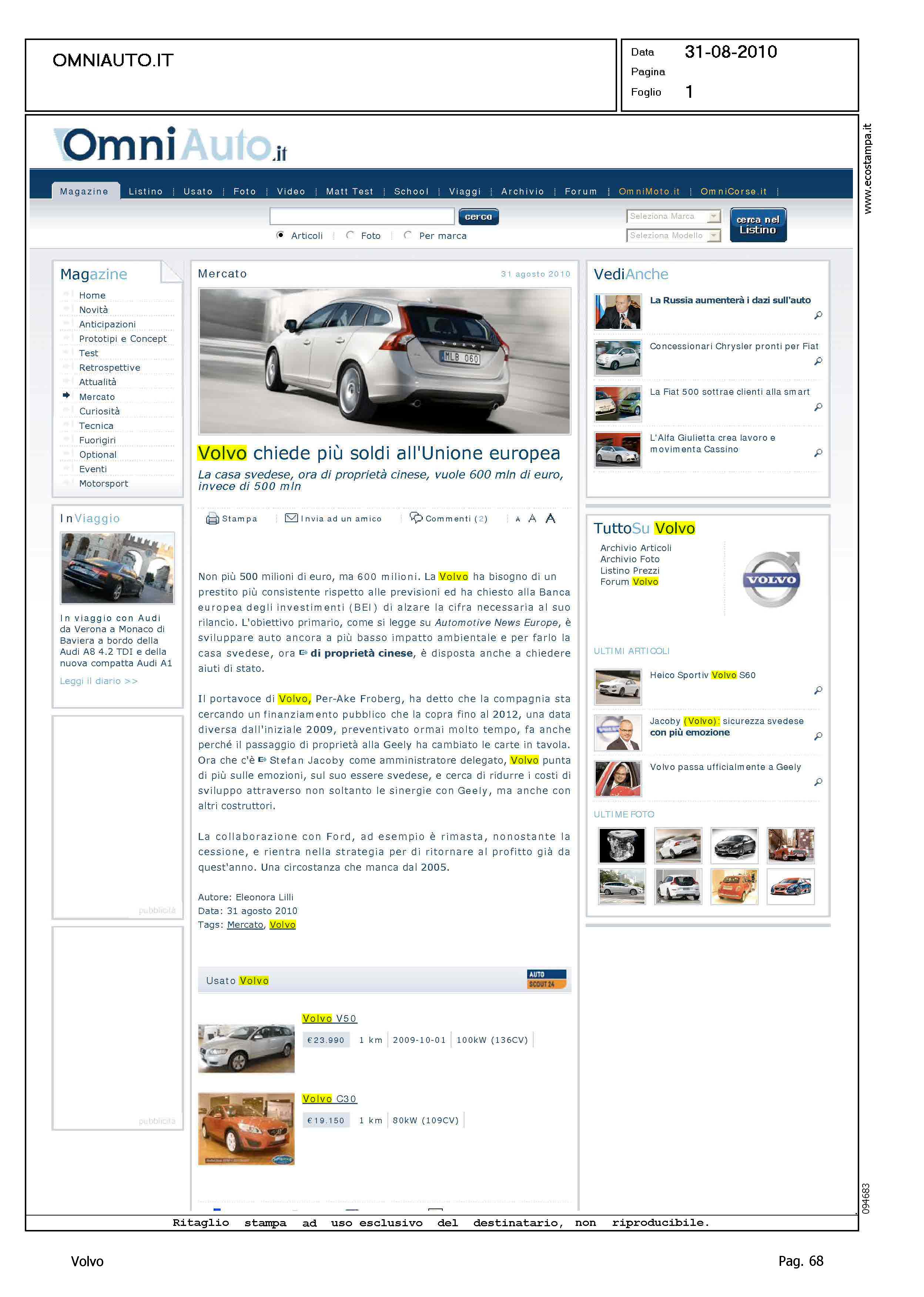 Author: Line: Corporate Model: Corporate Subject: - Title: VOLVO CHIEDE PIU' SOLDI ALL'UNIONE EUROPEAHighlight: GEELY - FINANZIAMENTO PUBBLICO UE