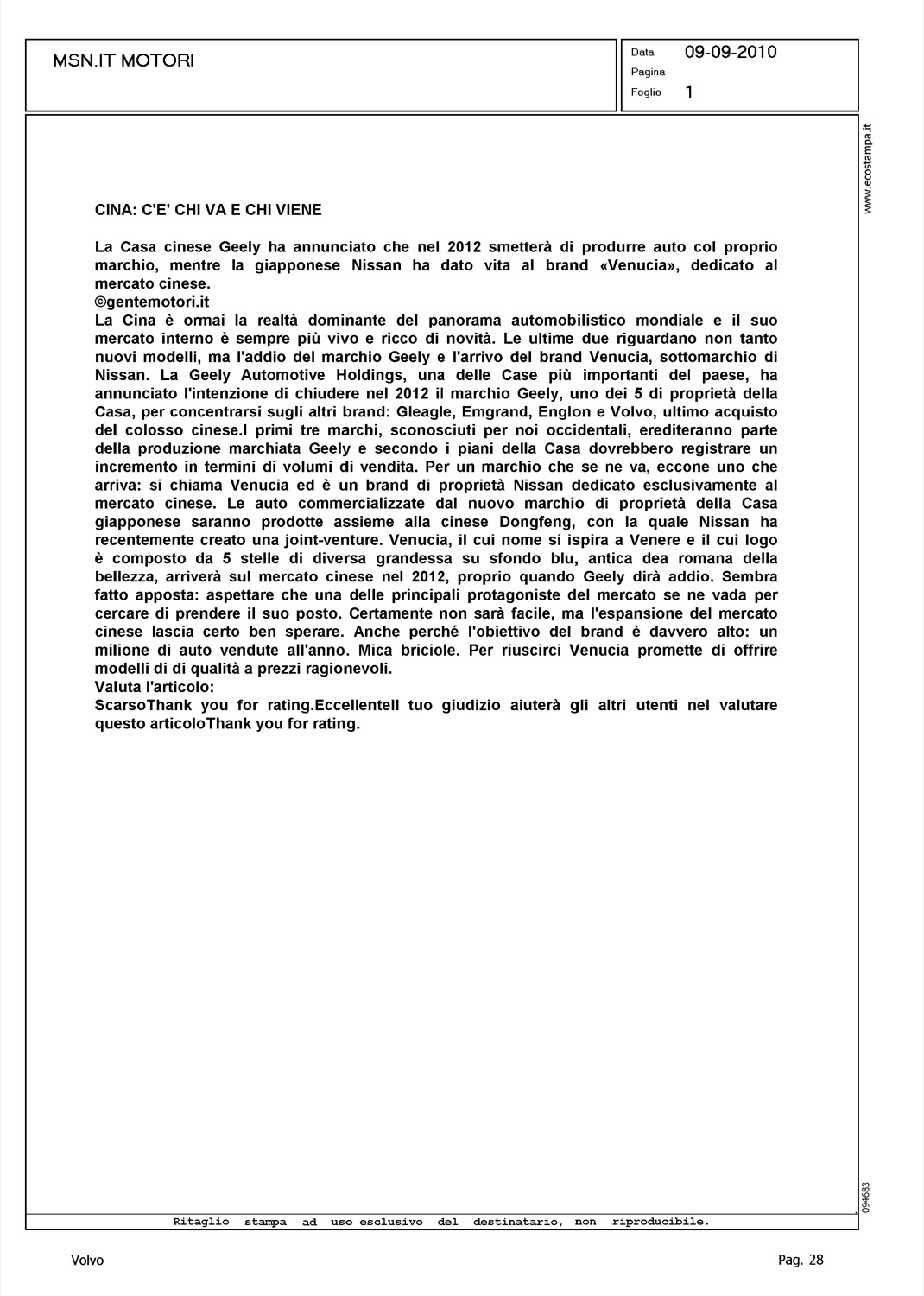 Author: Line: Corporate Model: Corporate Subject: - Title: CINA: C'E' CHI VA E CHI VIENEHighlight: SVILUPPO POLITICA INDUSTRIALE GEELY MERCATI AUTO