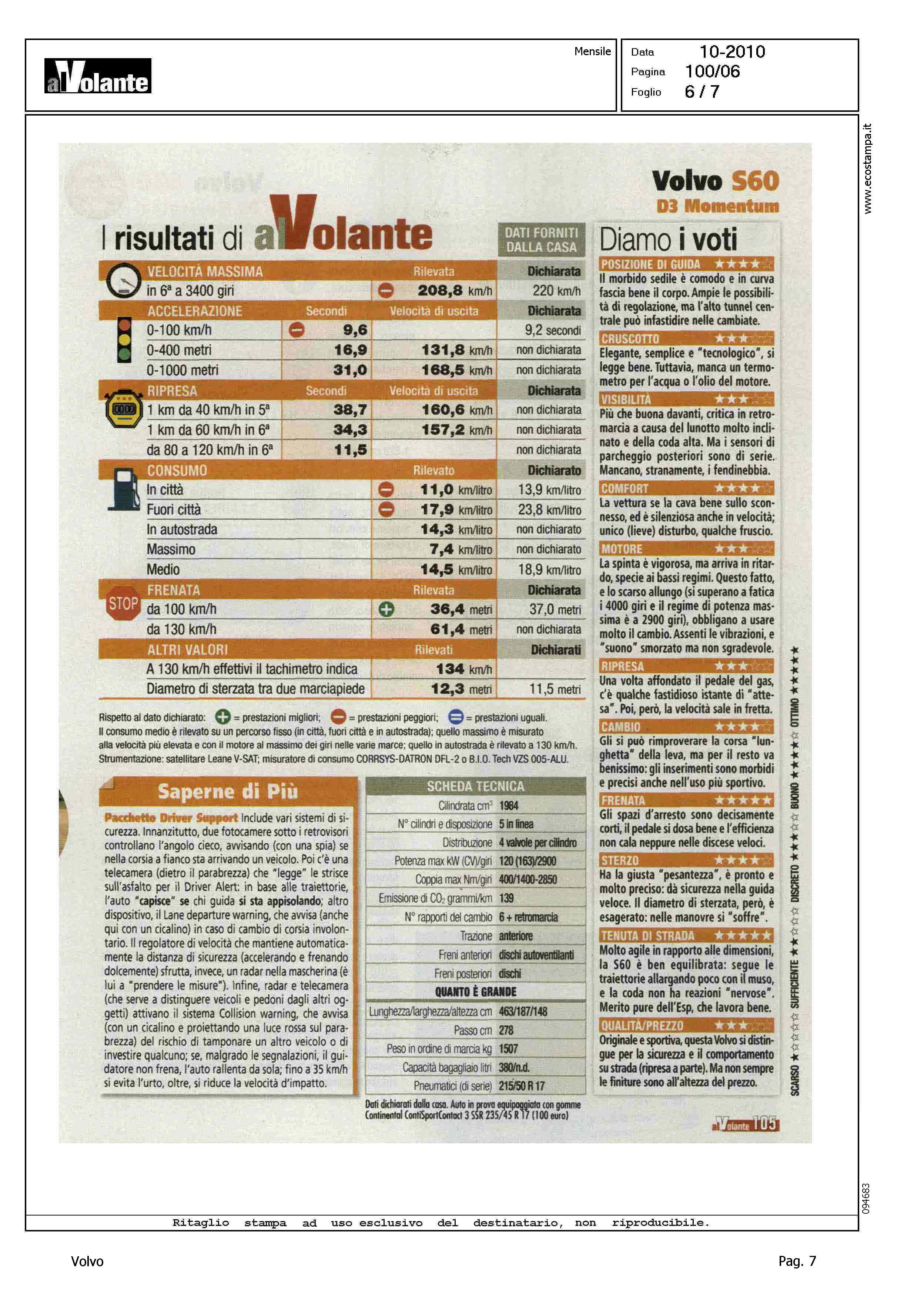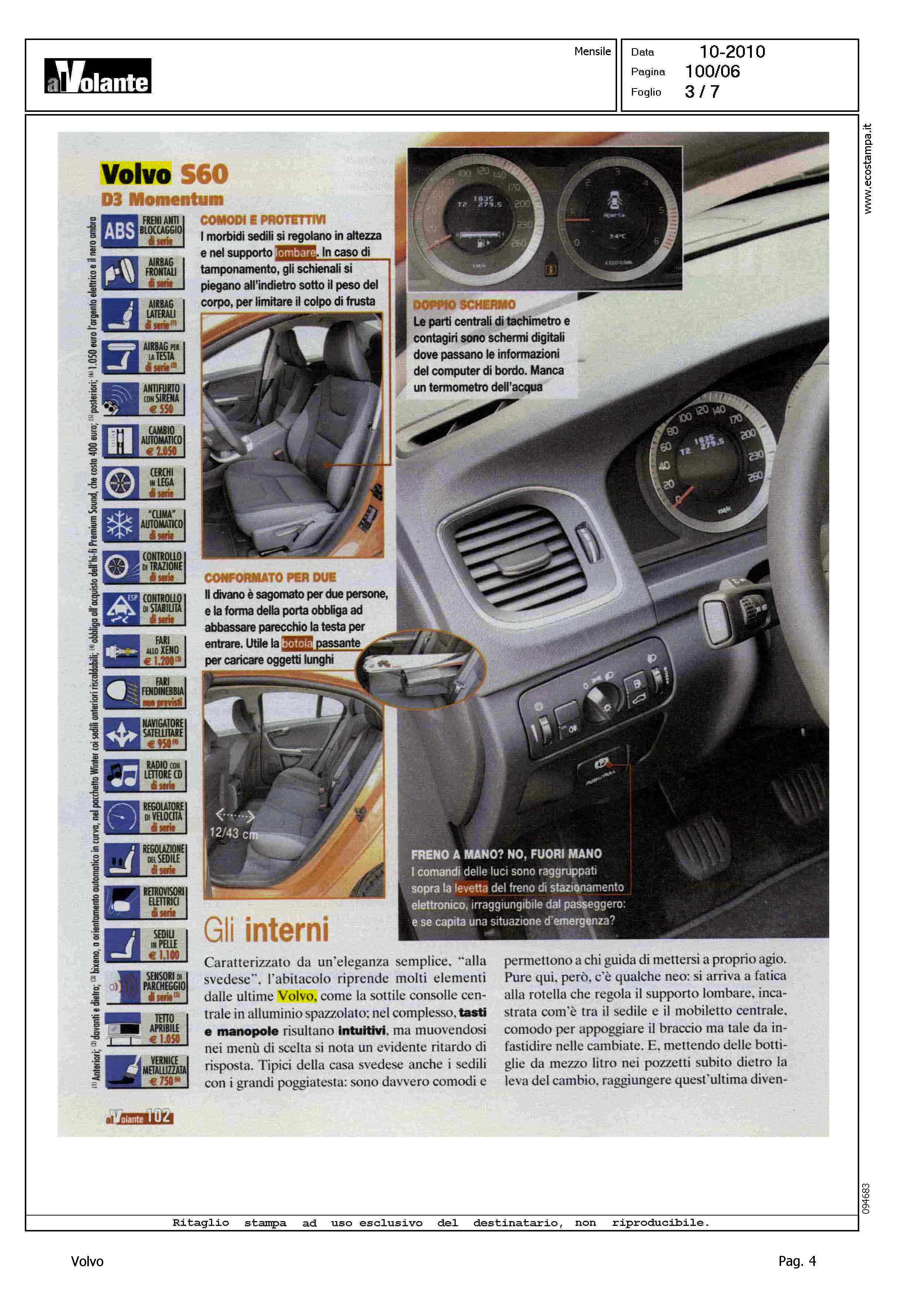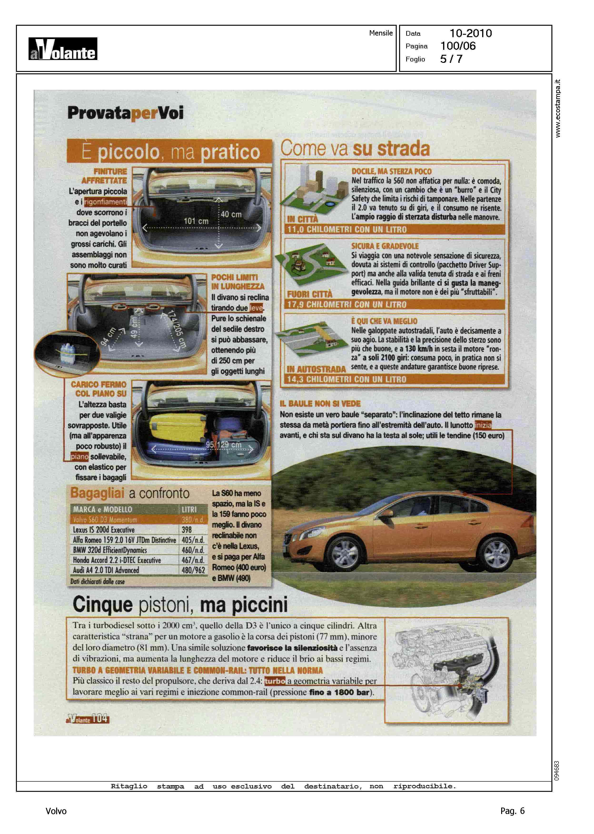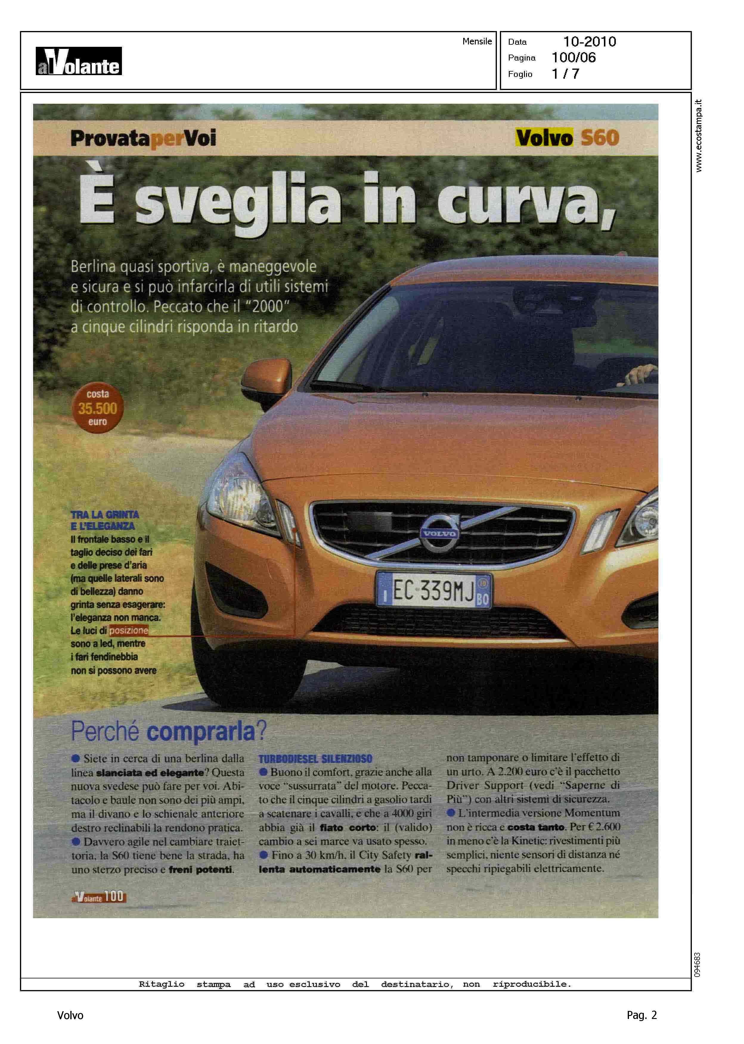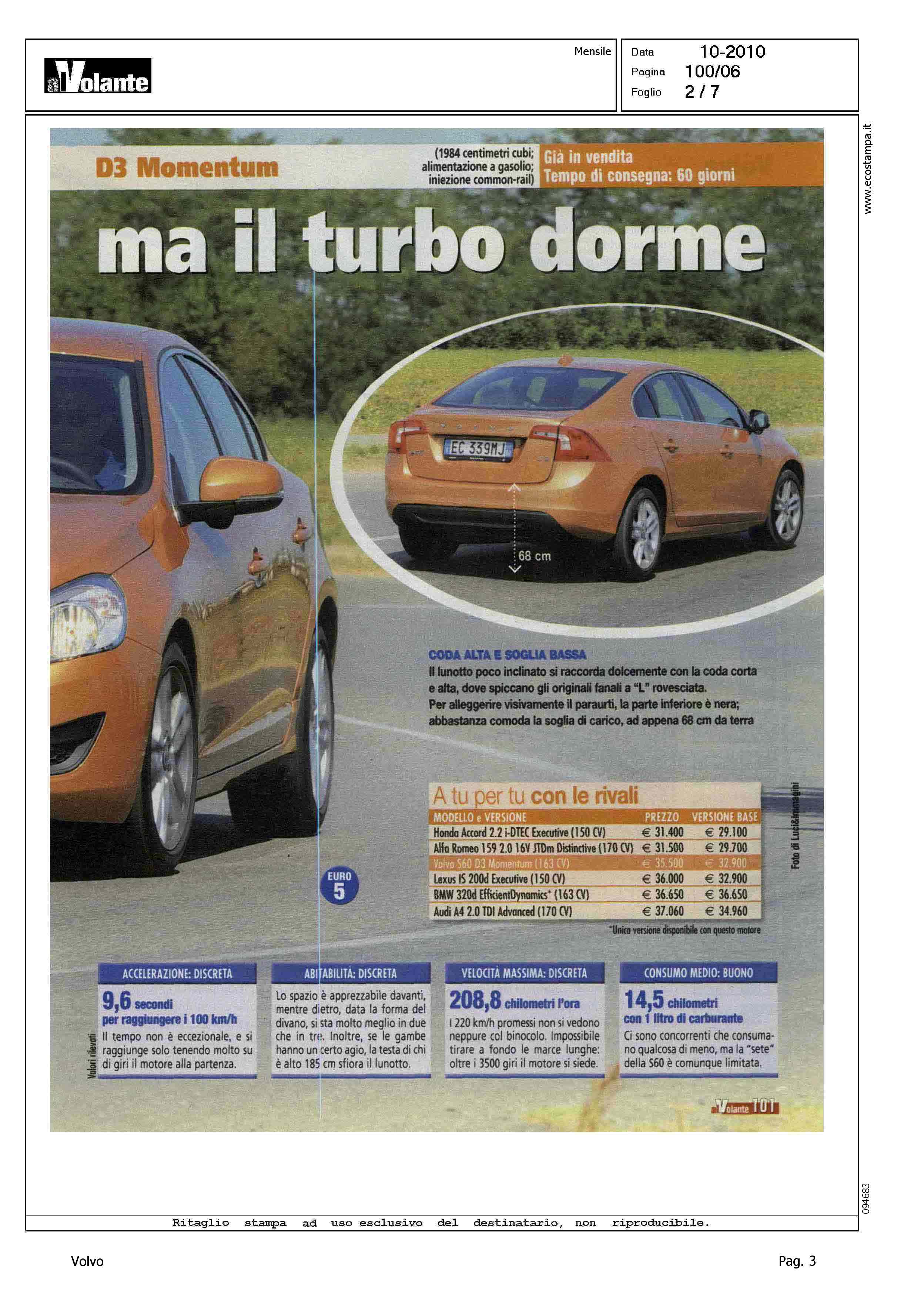 Highlight: AL VOLANTE - OTTOBRE - PROVA SU STRADA - VOLVO S60 D3 MOMENTUM - EC339MJ - OCCHIELLO, BERLINA QUASI SPORTIVA, E' MANEGGEVOLE E SICURA E SI PUO' INFARCIRLA DI UTILI SISTEMI DI CONTROLLO. PECCATO CHE IL "2000" A CINQUE CILINDRI RISPONDA IN RITARDO - "...PERCHE' COMPRARLA: SLANCIATA ED ELEGANTE - FRENI POTENTI - TURBODIESEL SILENZIOSO, FIATO CORTO - CITY SAFETY, RALLENTA AUTOMATICAMENTE - MOMENTUM NON E' RICCA E COSTA TANTO..." - PREZZO, 35.500€ - TRA LA GRINTA E L'ELEGANZA - CODA ALTA E SOGLIA BASSA - A TU PER TU CON LE RIVALI: HONDA ACCORD 2.2 I-DTEC EXECUTIVE, 150CV, ALFAROMEO 159 2.016V JTDM DISTINCTIVE, 170CV, LEXUS IS 200D EXECUTIVE, 150CV, BMW 320D EFFICIENTDYNAMICS, 163CV, AUDI A4 2.0 TDI ADVANCED, 170 CON RELATIVI PREZZO E COSTO VERSIONE BASE - COME VA SU STRADA: CITTA', DOCILE MA STERZA POCO - FUORI CITTA', SICURA E GRADEVOLE - IN AUTOSTRADA, E' QUI CHE VA MEGLIO - DIAMO I VOTI, STELLE, MAX 5: POSIZIONE DI GUIDA/4 - CRUSCOTTO/3 - VISIBILITA'/3 - CONFORT/4 - MOTORE/3 - RIPRESA/3 - CAMBIO/4 - FRENATA/5 - STERZO/4 - TENUTA DI STRADA/5 - QUALITA', PREZZO/3 - CORPO ARTICOLO: INTERNI, BAGAGLIAIO, MOTORE, LE CONCORRENTI