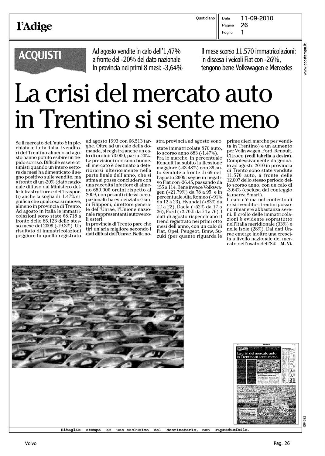 Author: Line: Corporate Model: Corporate Subject: - Title: LA CRISI DEL MERCATO AUTO IN TRENTINO SI SENTE MENOHighlight: MERCATO ITALIA - AGOSTO