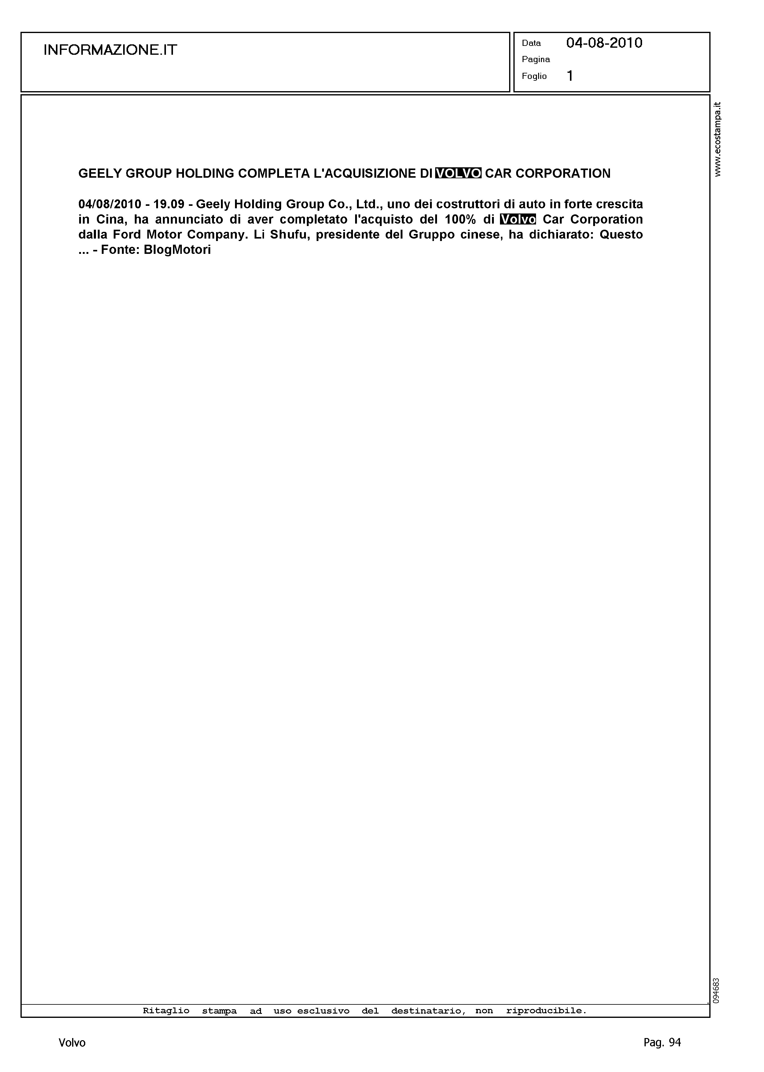 Author: Line: Corporate Model: Corporate Subject: - Title: GEELY GROUP HOLDING COMPLETA L'ACQUISIZIONE DI VOLVO CAR CORPORATIONHighlight: GEELY - VOLVO - CHIUSURA PROCESSO ACQUISIZIONE