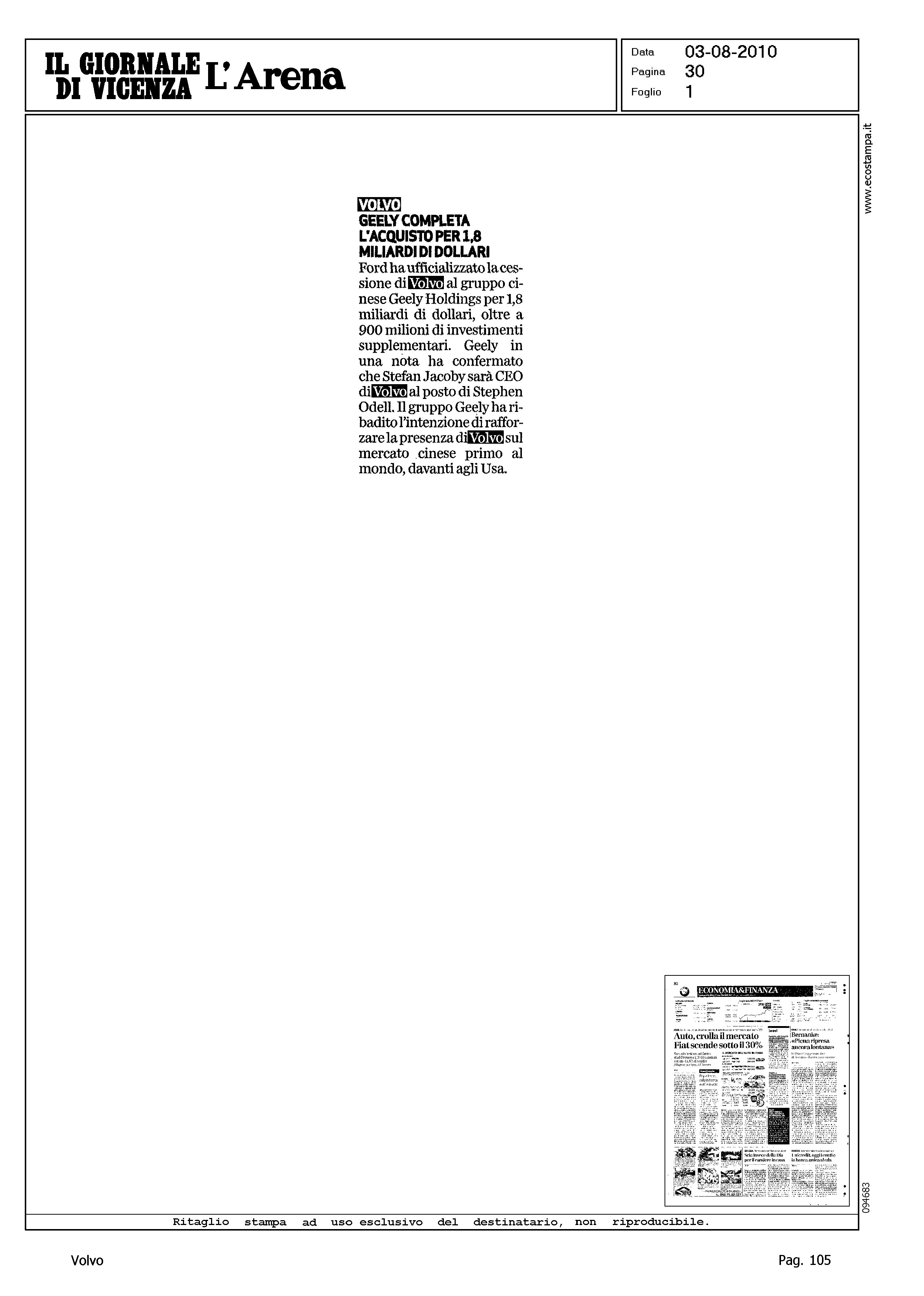 Author: Line: Corporate Model: Corporate Subject: - Title: VOLVO - GEELY COMPLETA L'ACQUISTO PER 1,8 MILIARDI DI DOLLARIHighlight: GEELY - VOLVO