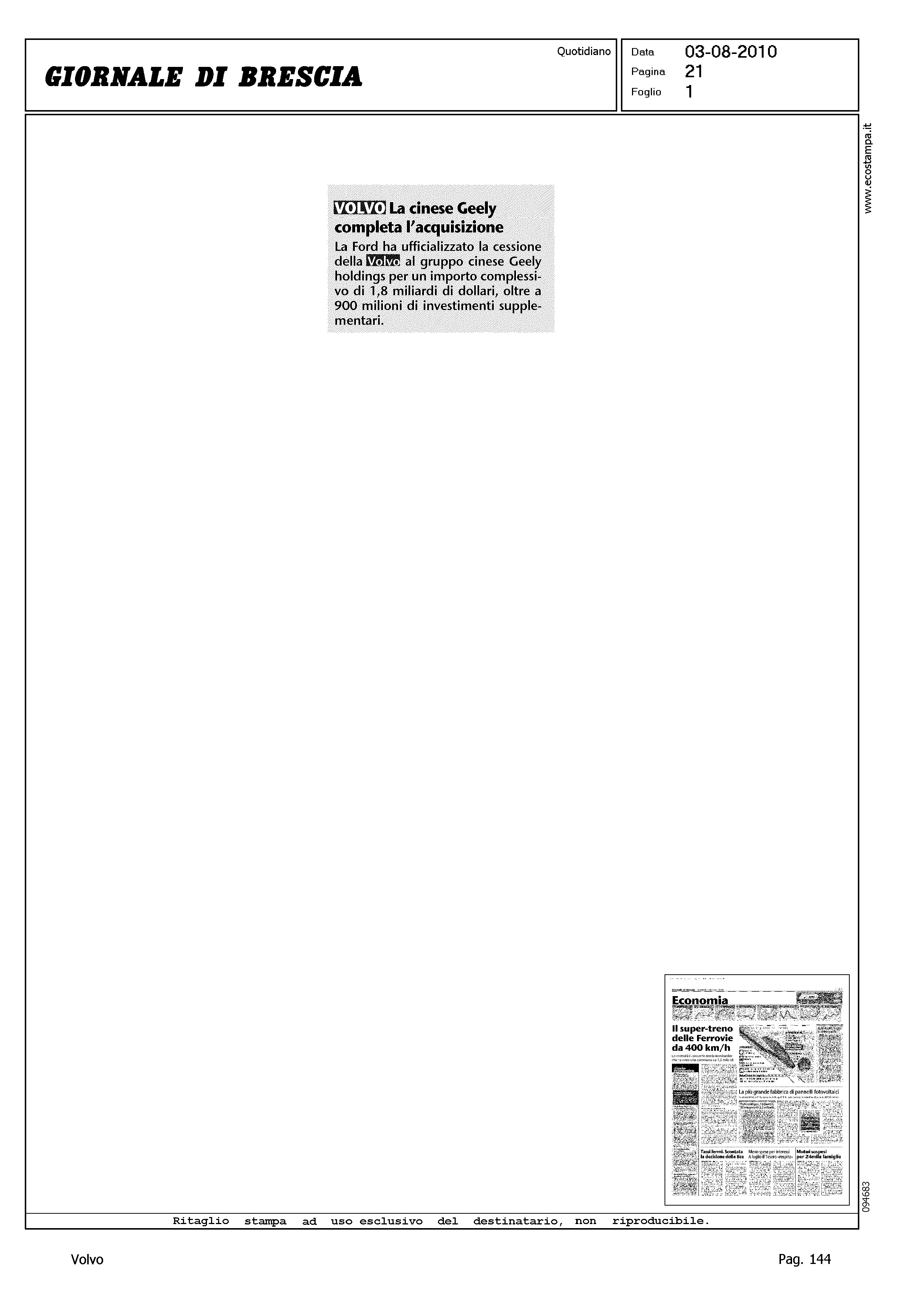 Author: Line: Corporate Model: Corporate Subject: - Title: VOLVO - LA CINESE GEELY COMPLETA L'ACQUISIZIONEHighlight: GEELY - VOLVO