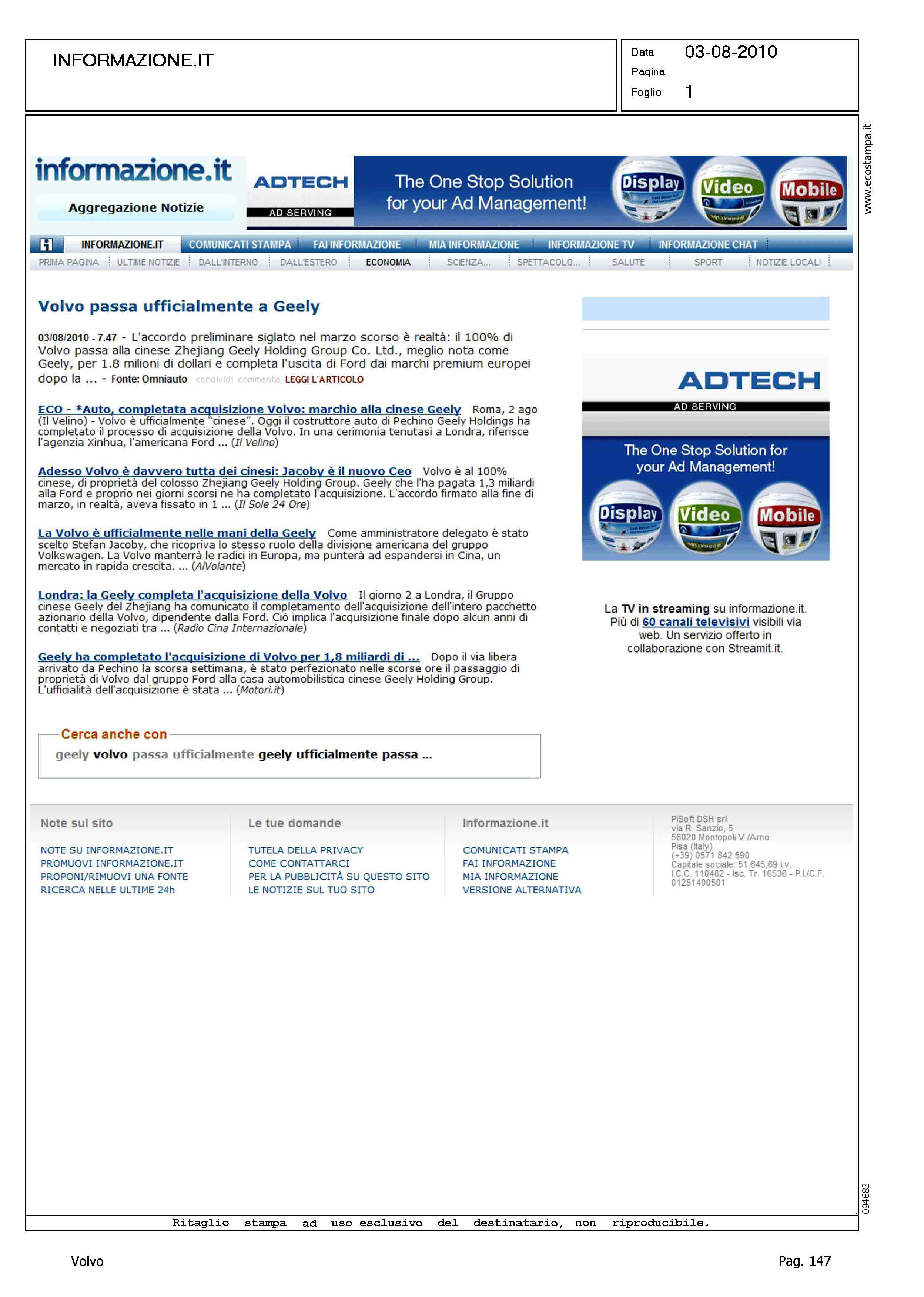 Author: Line: Corporate Model: Corporate Subject: - Title: AGGREGATORE DI NOTIZIE - 6 TITOLI - VOLVO PASSA UFFICIALMENTE A GEELYHighlight: AGGREGATORE DI NOTIZIE - 6 NOTIZIE - GEELY - VOLVO COMPLETAMENTO PROCEDURA ACQUISIZIONE