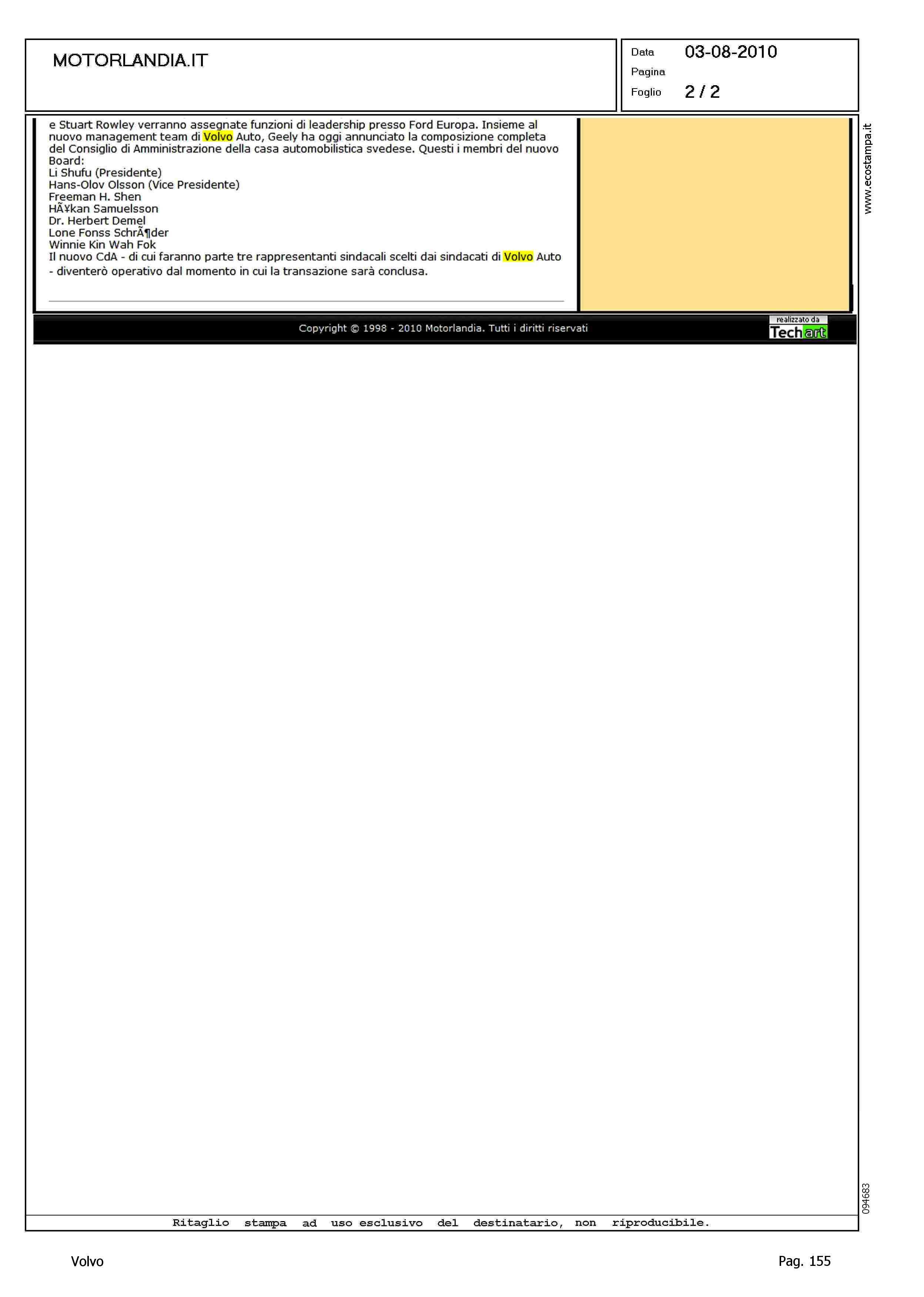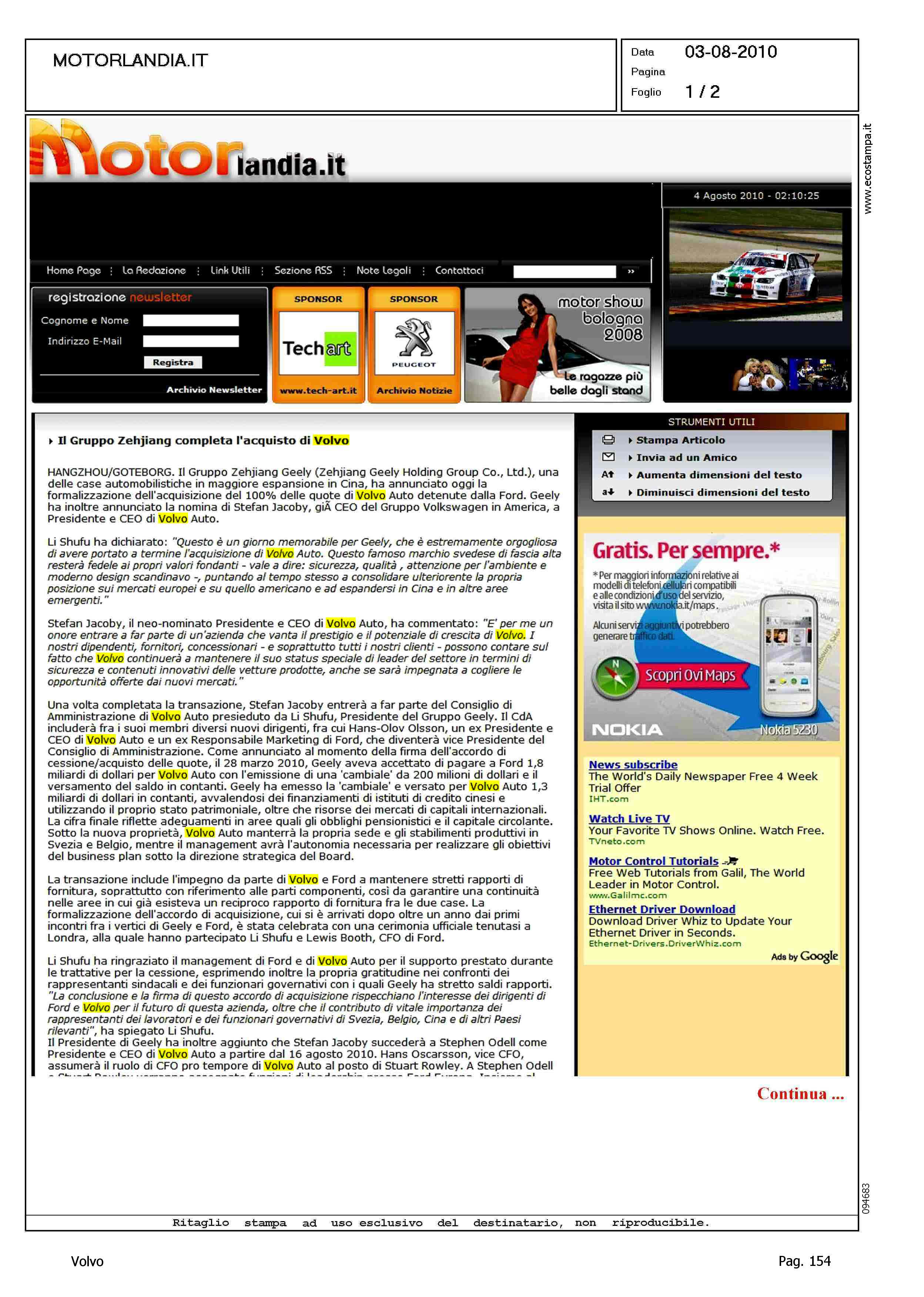 Author: Line: Corporate Model: Corporate Subject: - Title: IL GRUPPO ZEHJIANG COMPLETA L'ACQUISTO DI VOLVOHighlight: GEELY - VOLVO