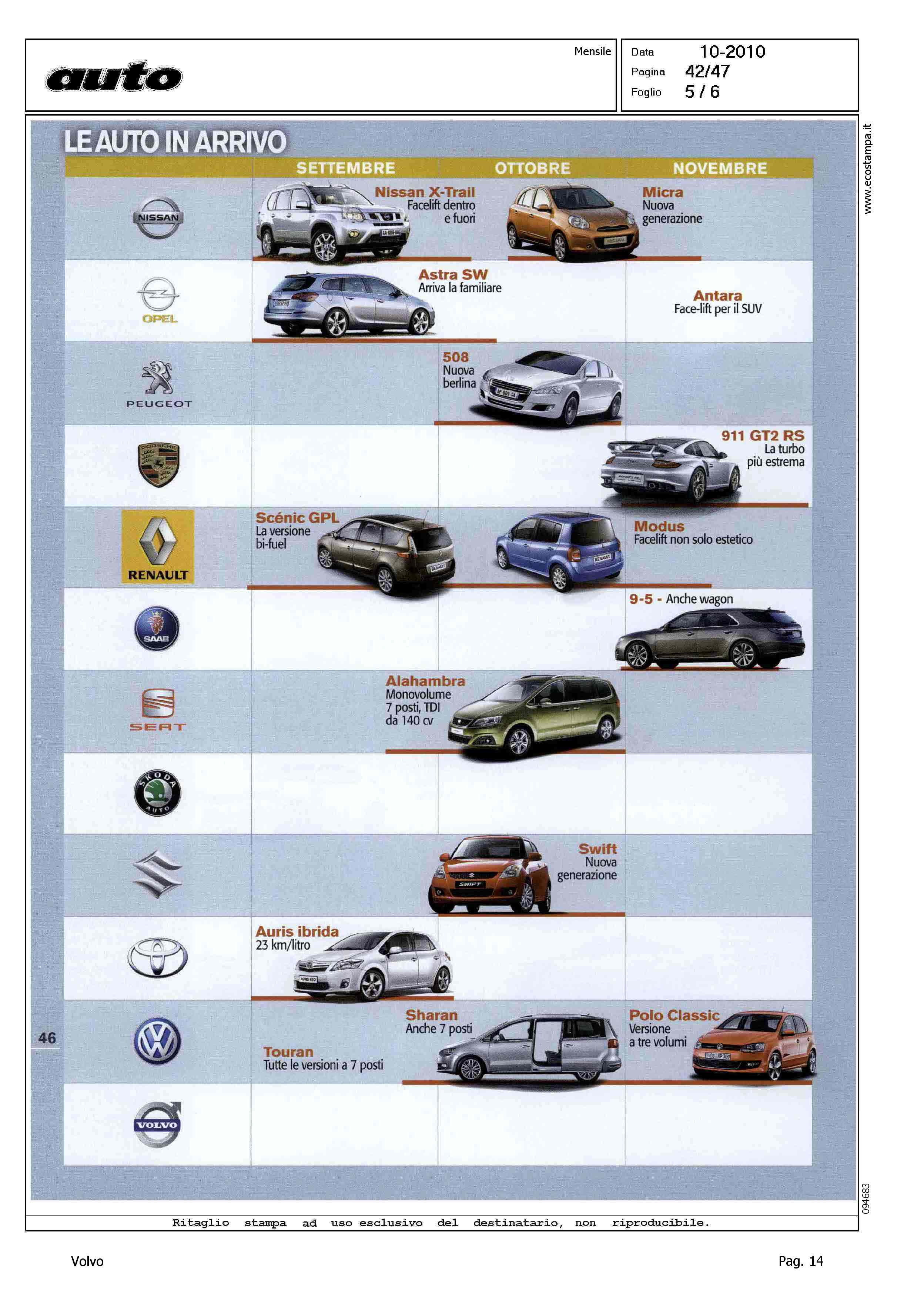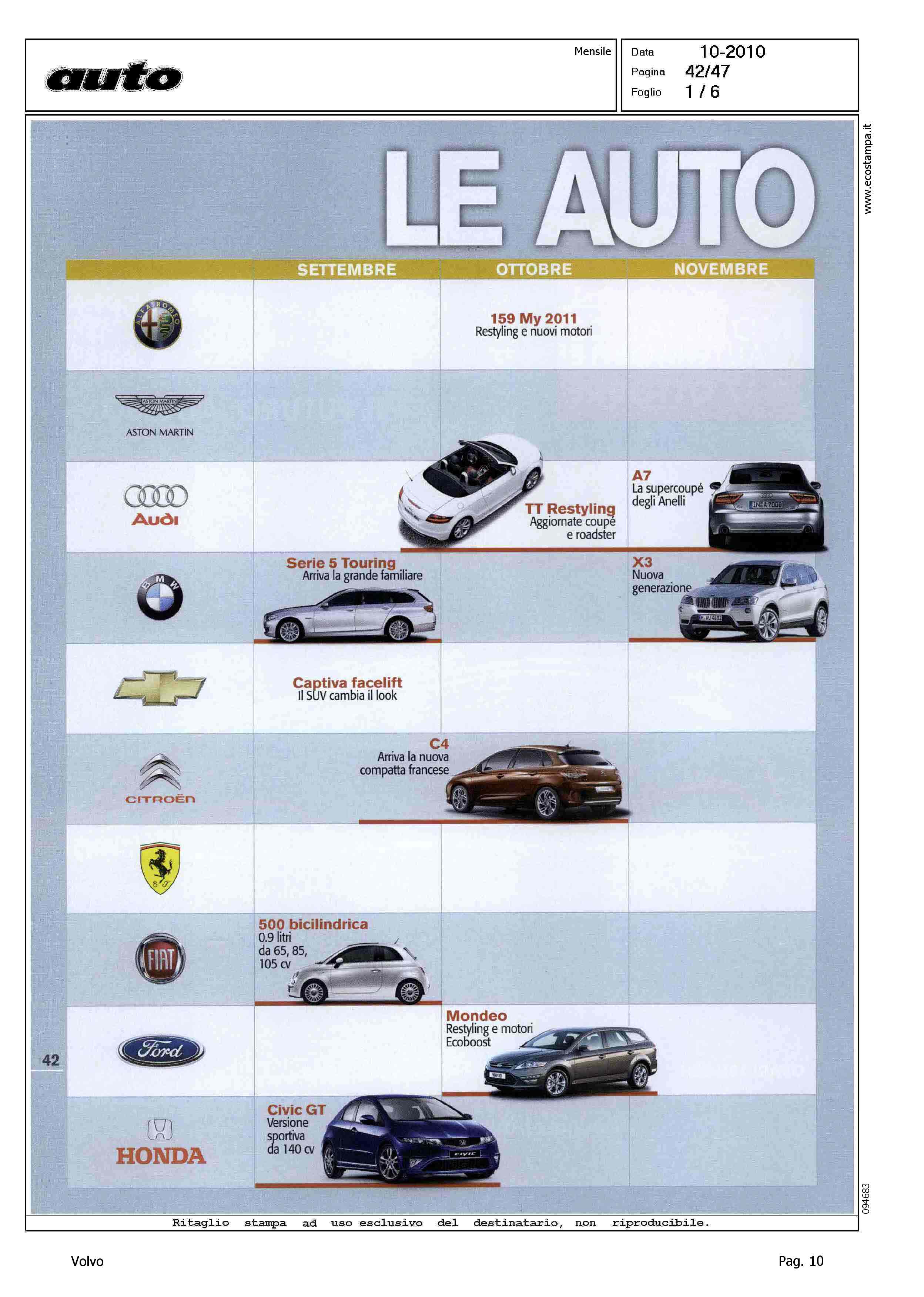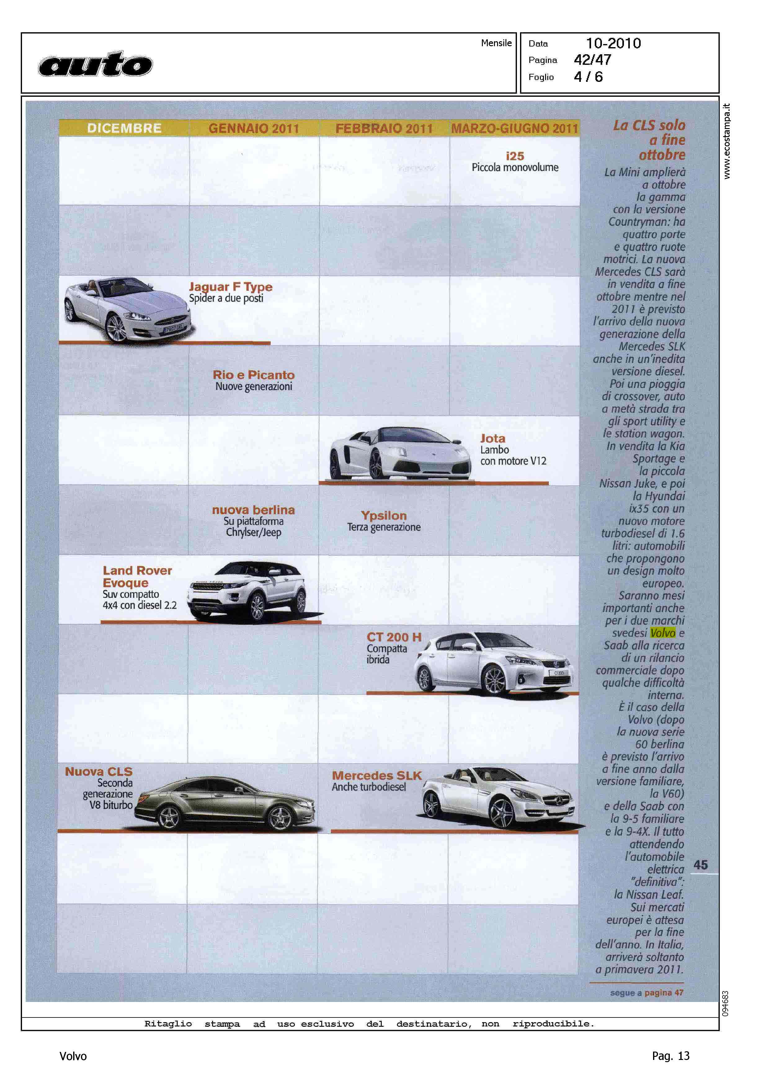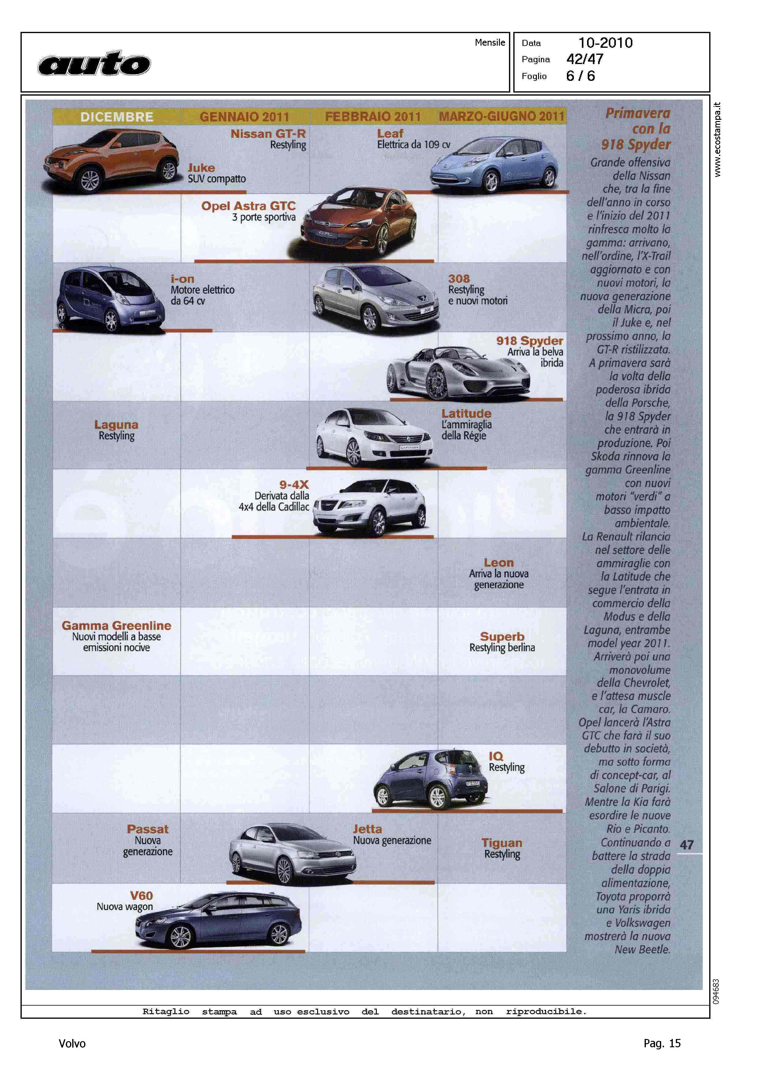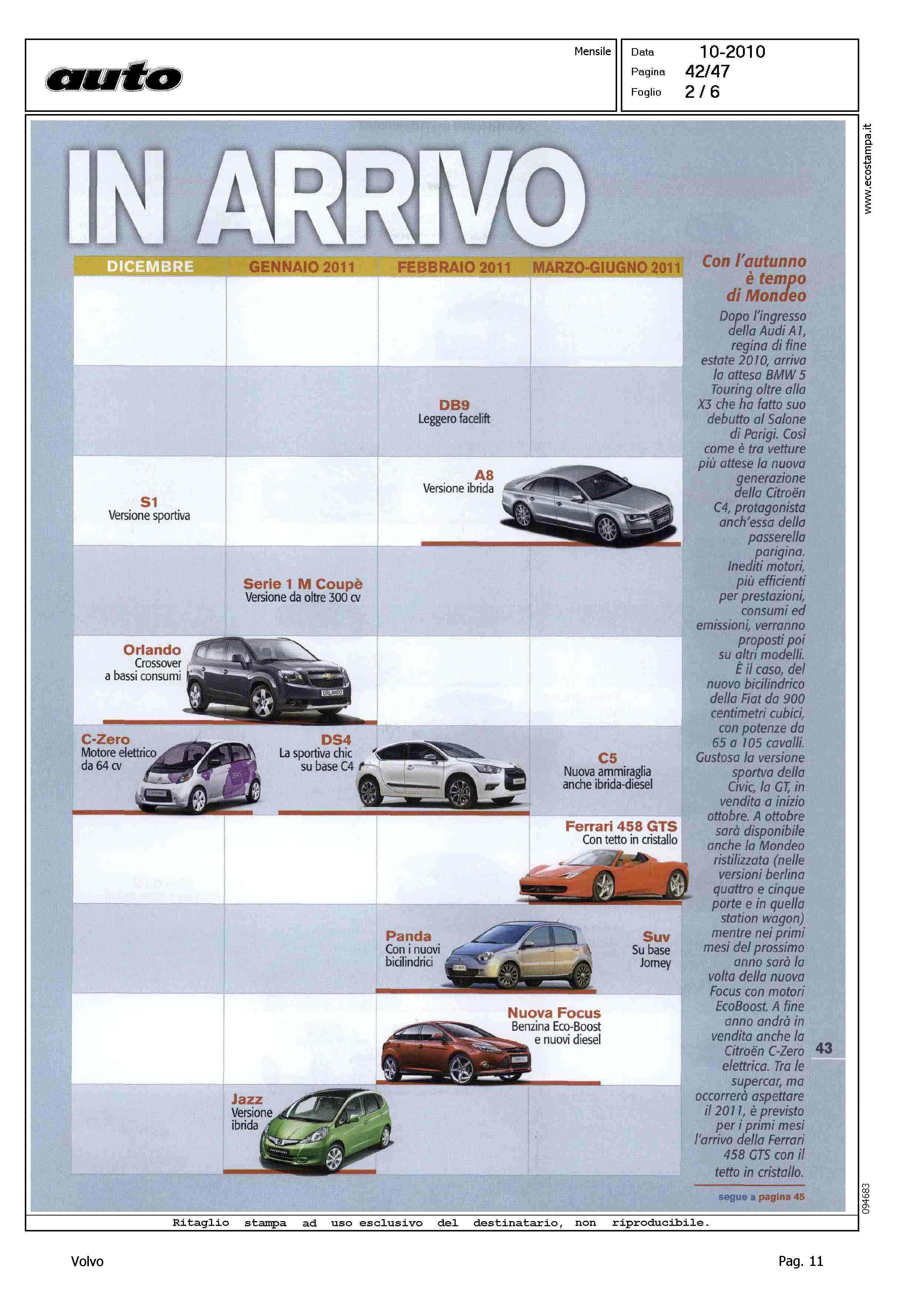 Author: Line: Corporate Model: Corporate Subject: - Title: LE AUTO IN ARRIVOHighlight: TABELLA NOVITA' 2010 - 2011 - VOLVO V60