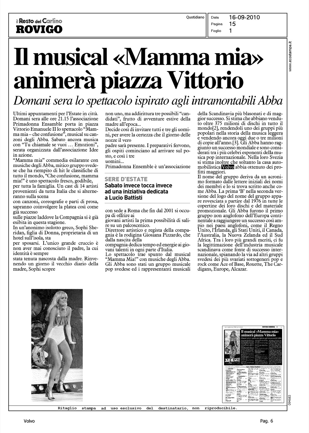 Author: Line: Corporate Model: Corporate Subject: - Title: IL MUSICAL 'MAMMA' ANIMERA' PIAZZA VITTORIOHighlight: (EDIZIONE ROVIGO) - CITAZIONE, VOLVO - CONCERTO ABBA ROVIGO