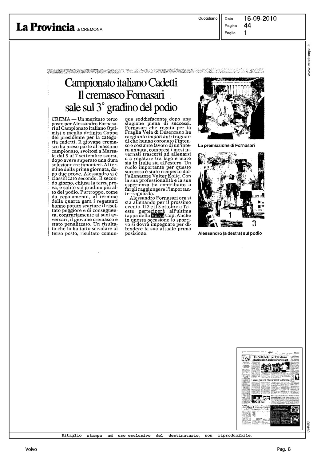 Author: Line: Corporate Model: Corporate Subject: Volvo Cup Title: CAMPIONATO ITALIANO CADETTI - IL CREMASCO FORNASARI SALE SUL 3° GRADINO DEL PODIOHighlight: ANNUNCIO REGATE DI TRIESTE, OTTOBRE