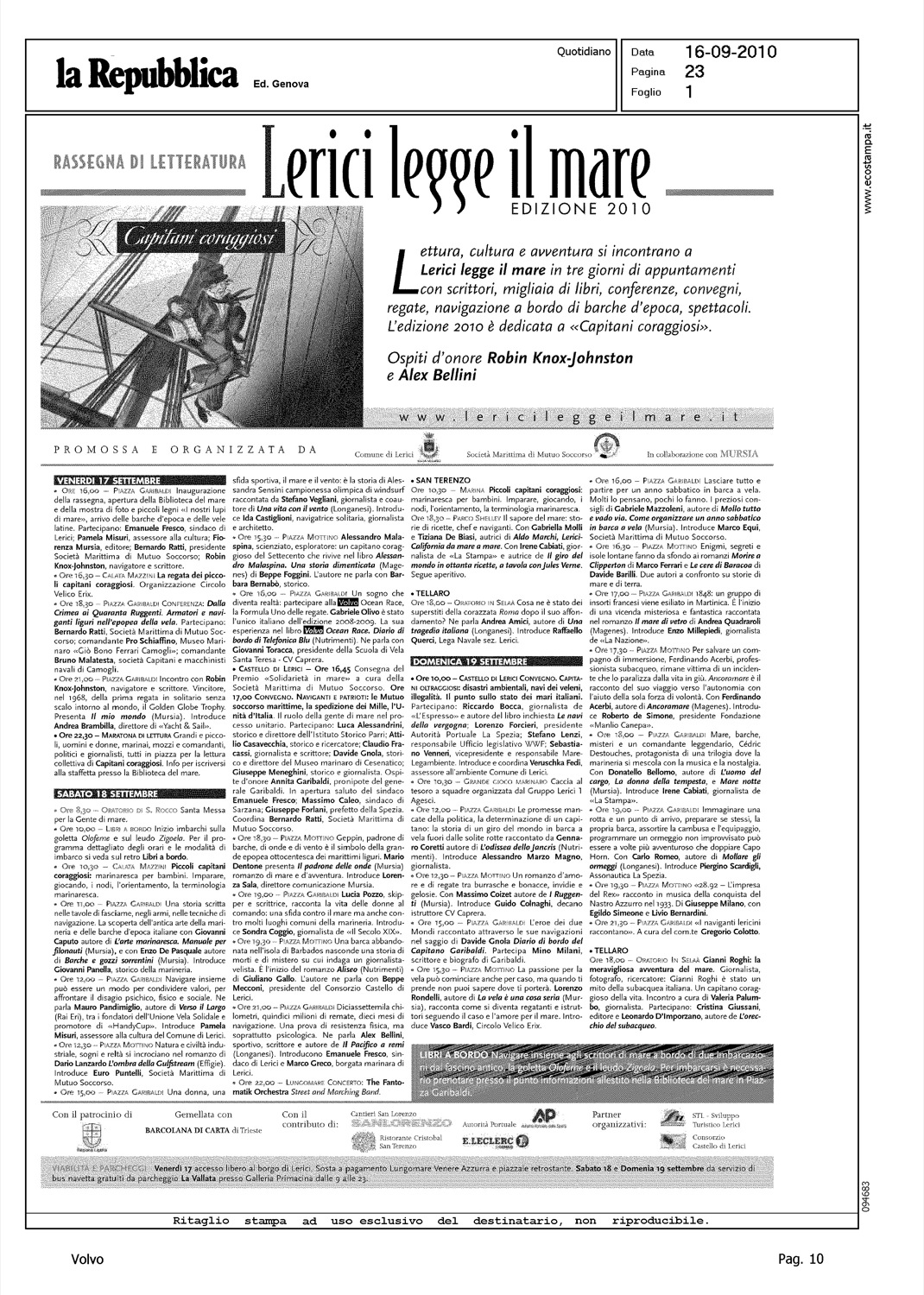 Author: Line: Corporate Model: Corporate Subject: Volvo Ocean Race Title: RASSEGNA LETTERATURA - LERICI LEGGE IL MARE - EDIZIONE 2010Highlight: (EDIZIONE GENOVA) - LERICI, OLIVO, DIARIO TELEFONICA BLU
