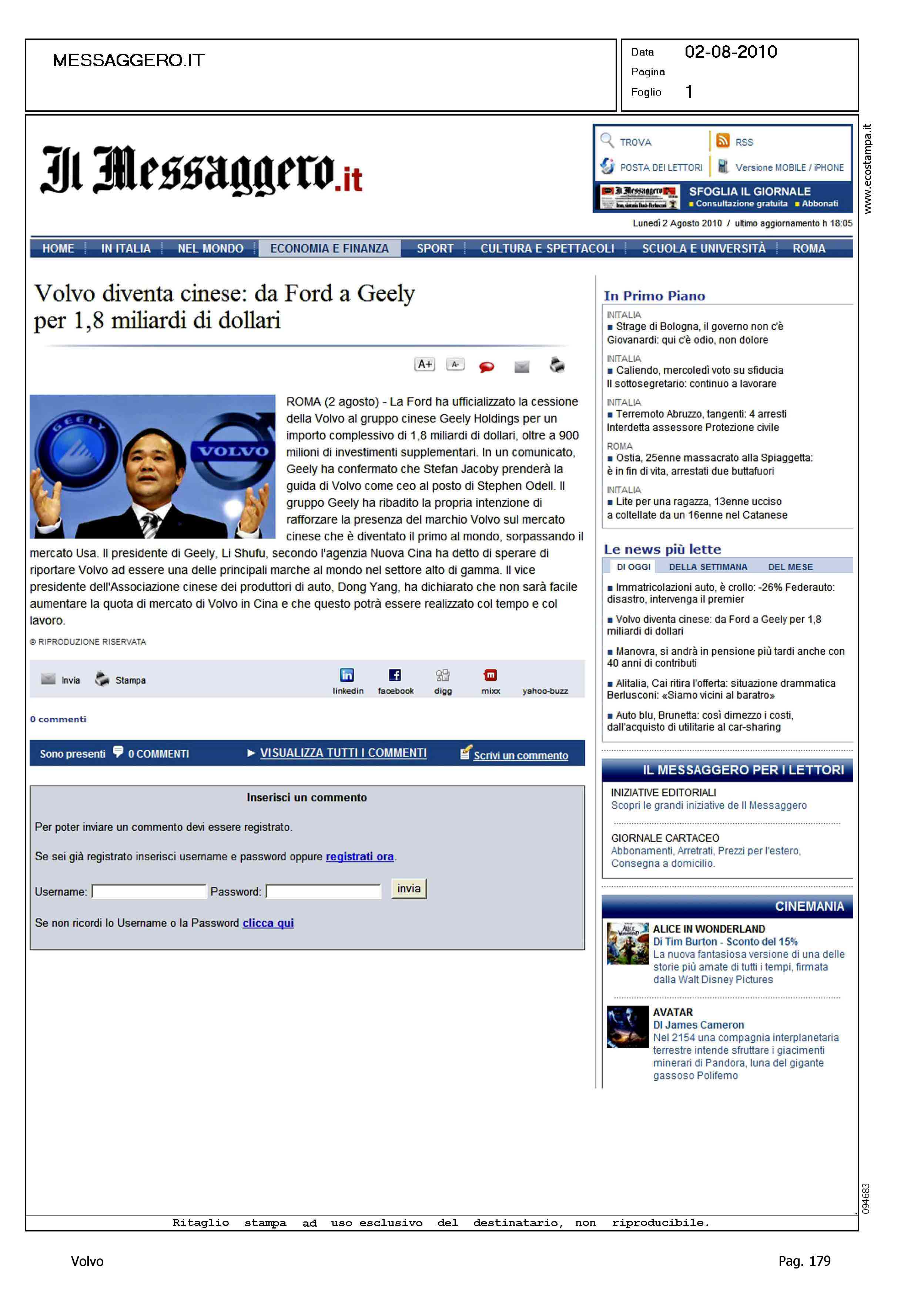Author: Line: Corporate Model: Corporate Subject: - Title: VOLVO DIVENTA CINESE: DA FORD A GEELY PER 1,8 MILIARDI DI DOLLARIHighlight: GEELY - VOLVO