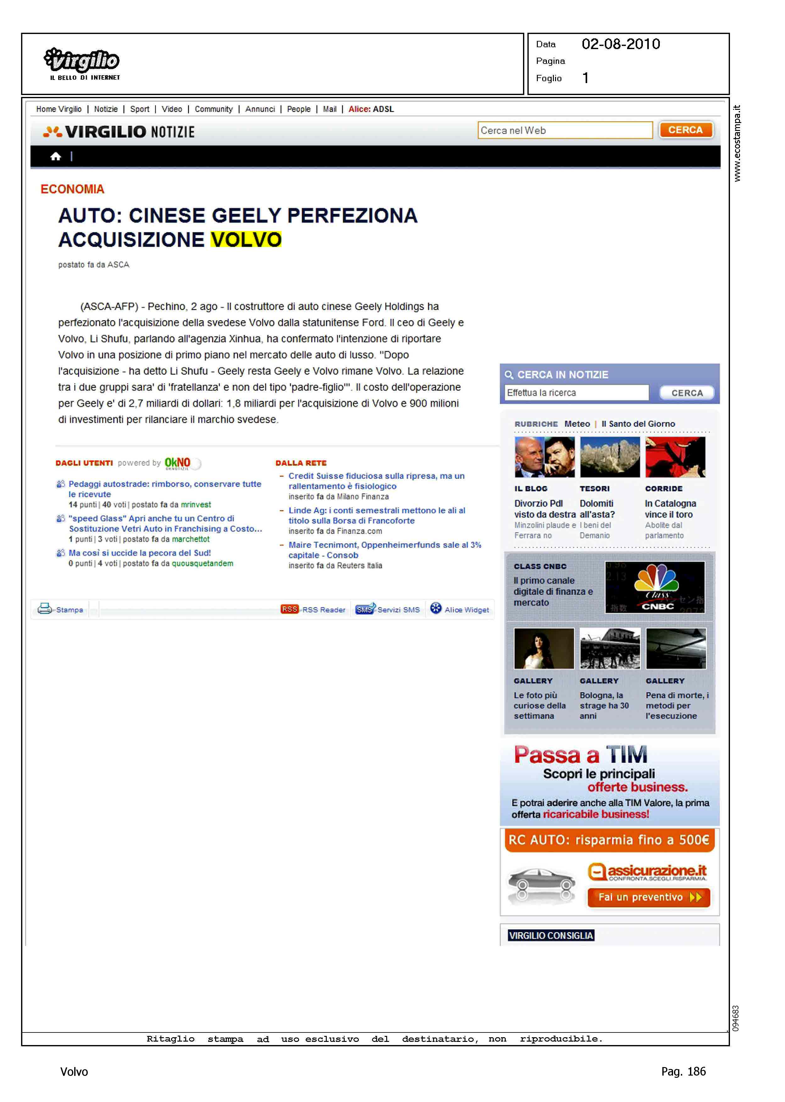 Author: Line: Corporate Model: Corporate Subject: - Title: AUTO: CINESE GEELY PERFEZIONA ACQUISIZIONE VOLVOHighlight: GEELY - VOLVO