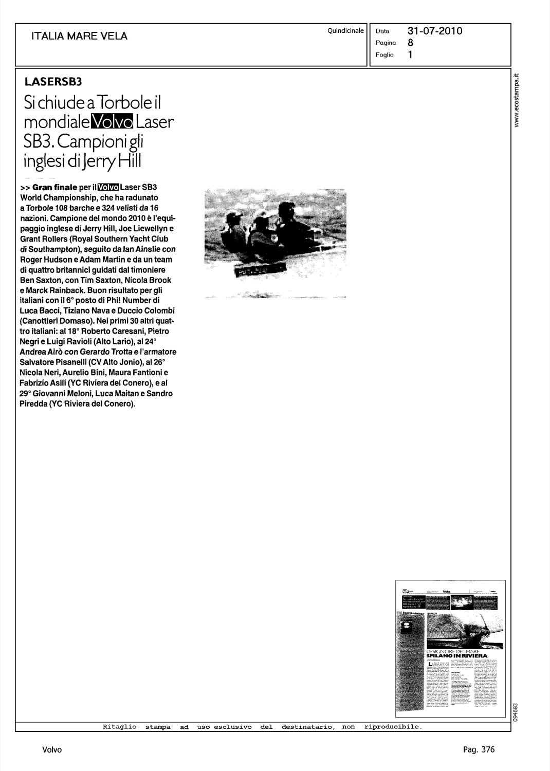 Author: Line: Corporate Model: Corporate Subject: Volvo Cup Title: LASER SB3 - SI CHIUDE A TORBOLE IL MONDIALE VOLVO LASER SB3 - CAMPIONI GLI INGLESI DI JERRY HILLHighlight: REGATE DI TORBOLE