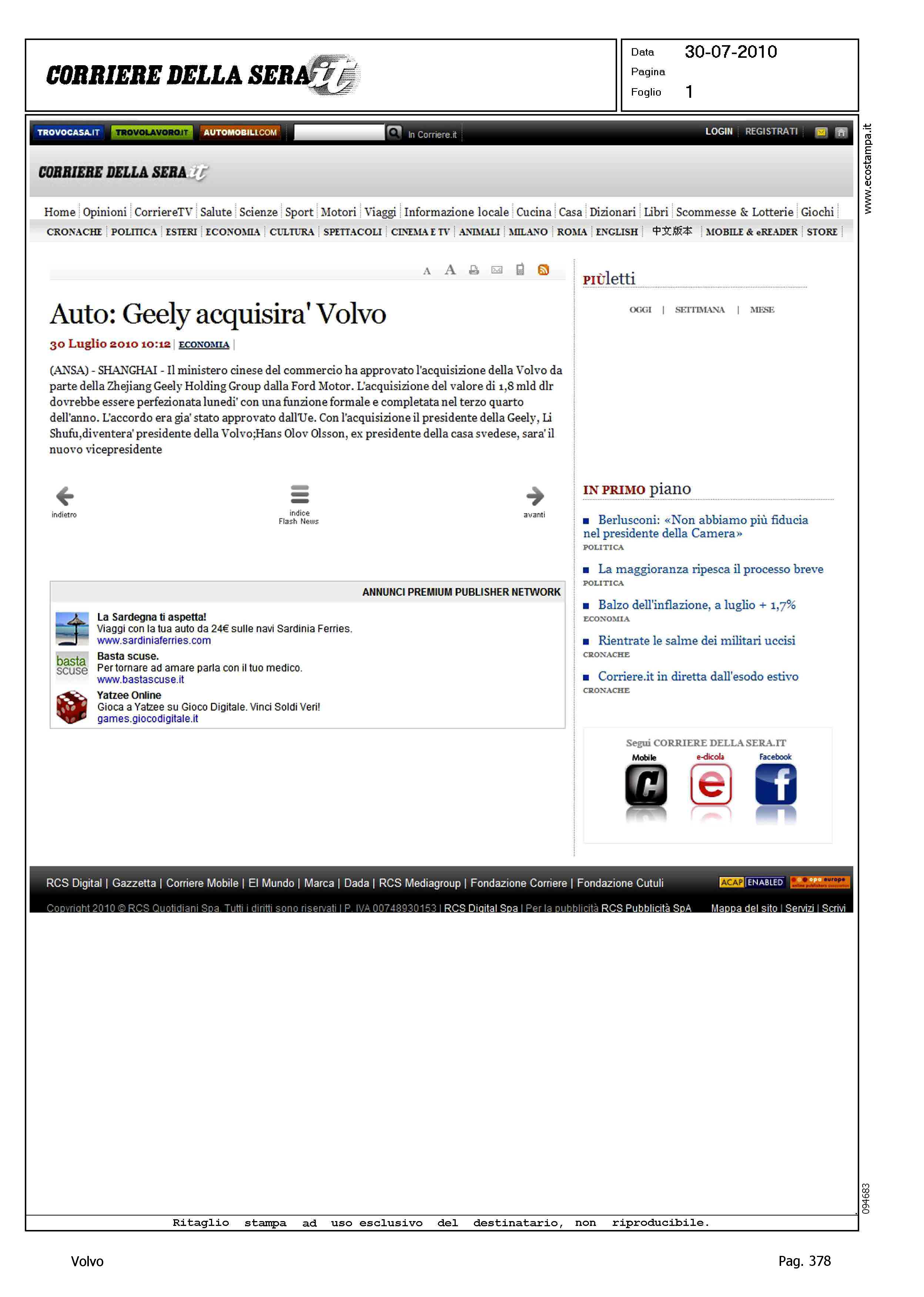 Author: Line: Corporate Model: Corporate Subject: - Title: AUTO: GEELY ACQUISIRA' VOLVOHighlight: GEELY - VOLVO