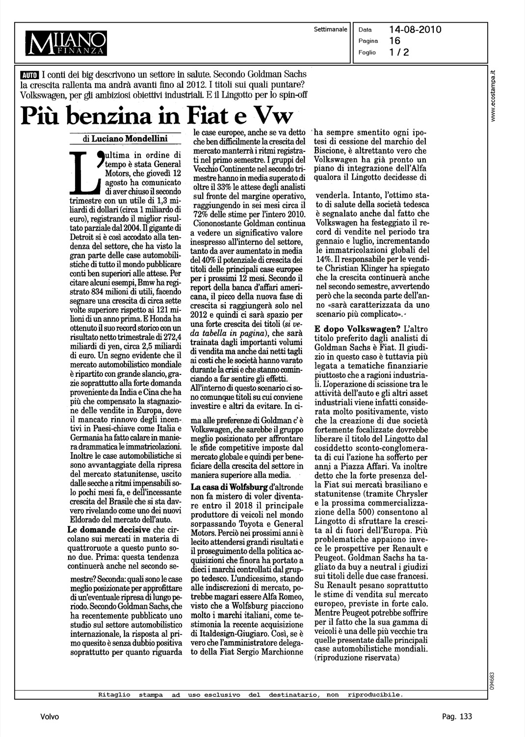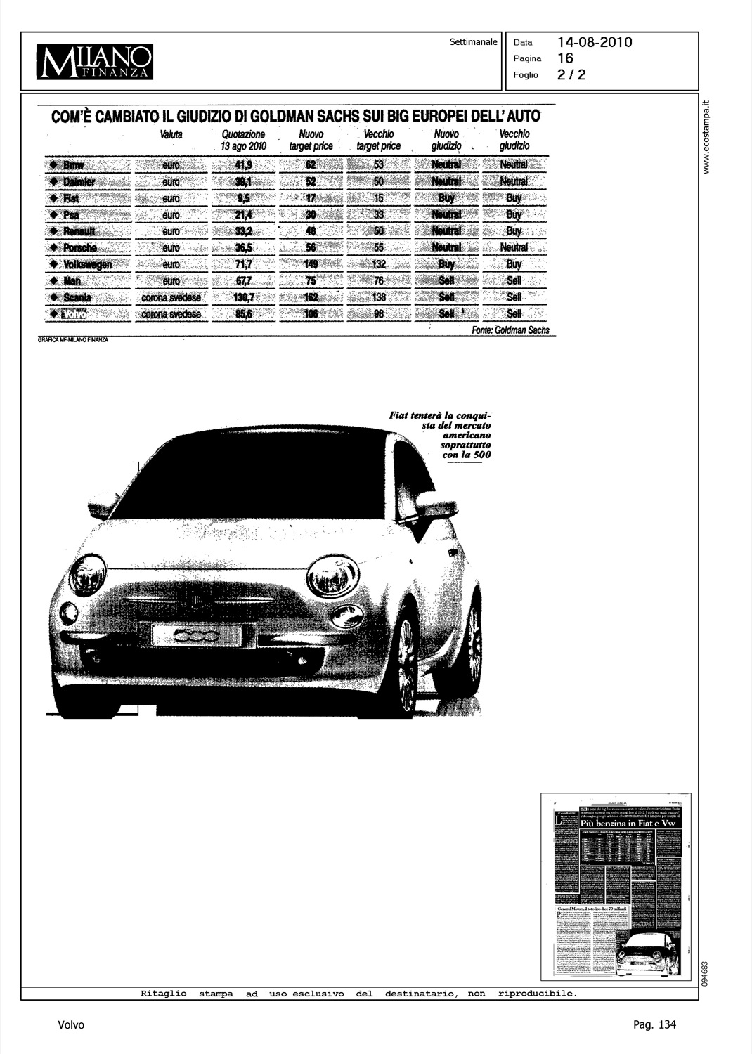 Author: MONDELLINI, LUCIANOLine: Corporate Model: Corporate Subject: - Title: PIU' BENZINA IN FIAT E VWHighlight: QUOTAZIONE AZIONE VOLVO - TABELLA - FONTE, GOLDMAN SACHS