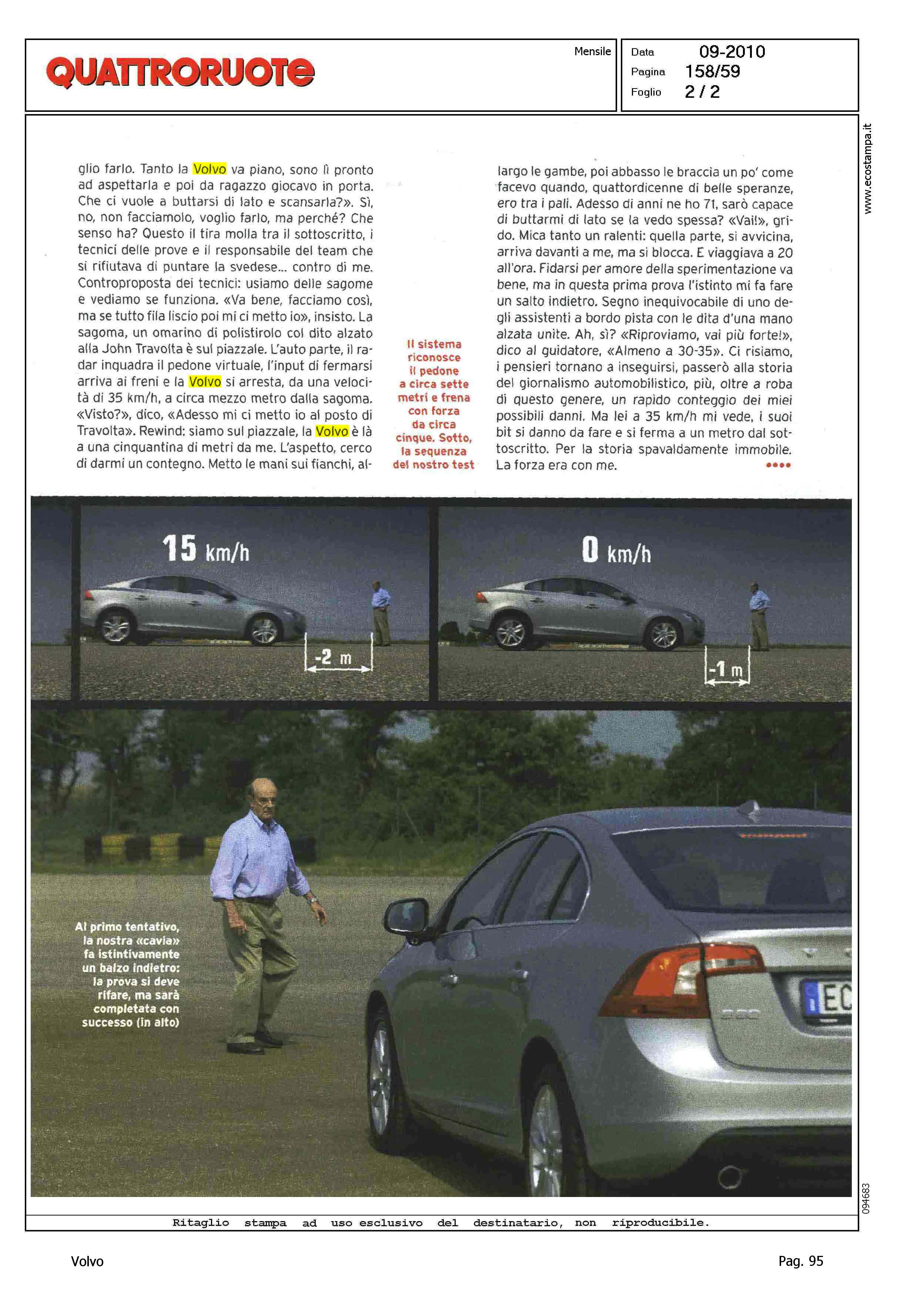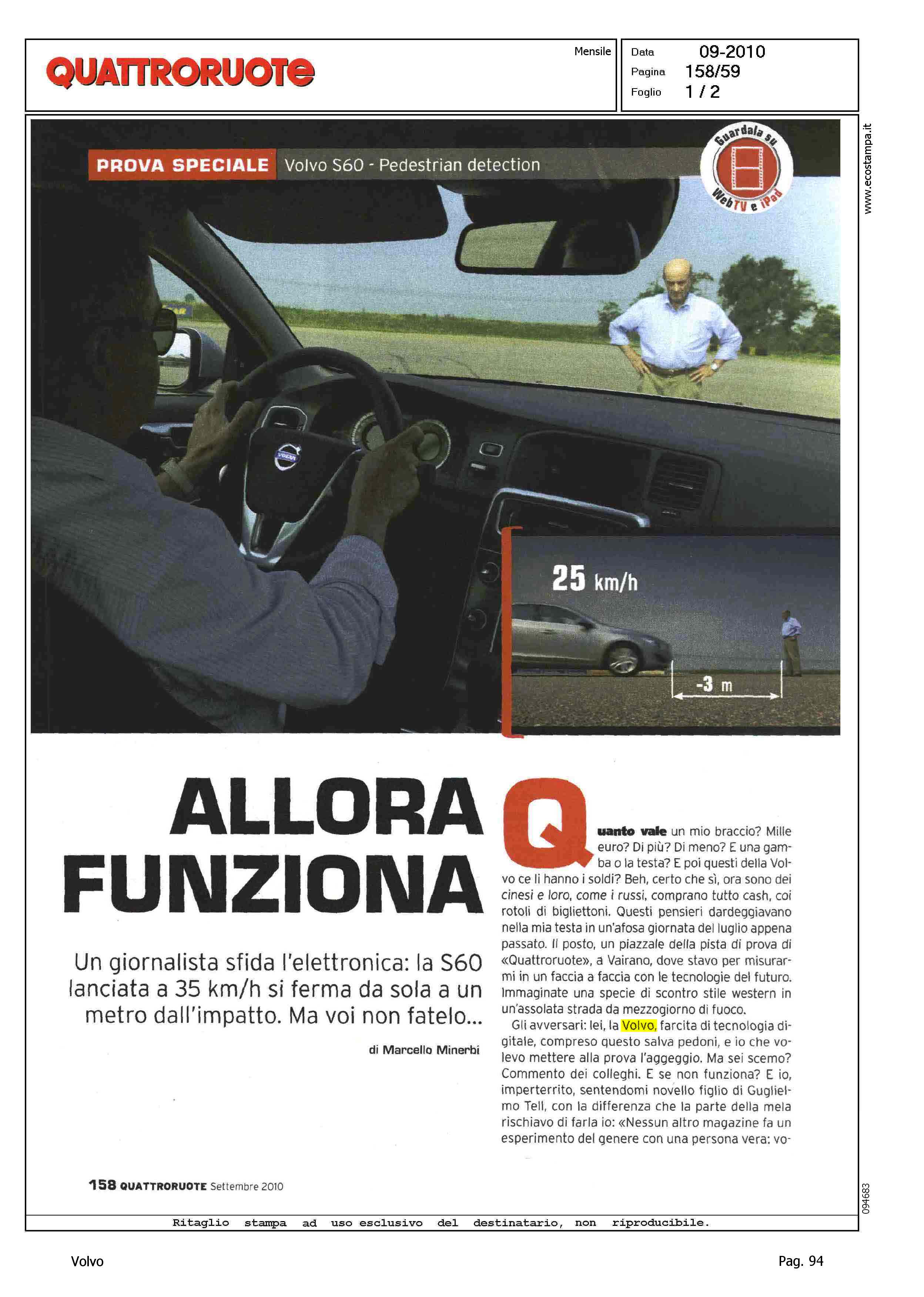 Author: MINERBI, MARCELLOLine: S60 Model: Linea S60 Testdrive Subject: - Title: ALLORA FUNZIONAHighlight: QUATTRORUOTE SETTEMBRE 2010 - TEST DAL VIVO DEL SISTEMA PEDESTRIAN DETECTION - COMMENTI DEL TESTER, MARCELLO MINERBI
