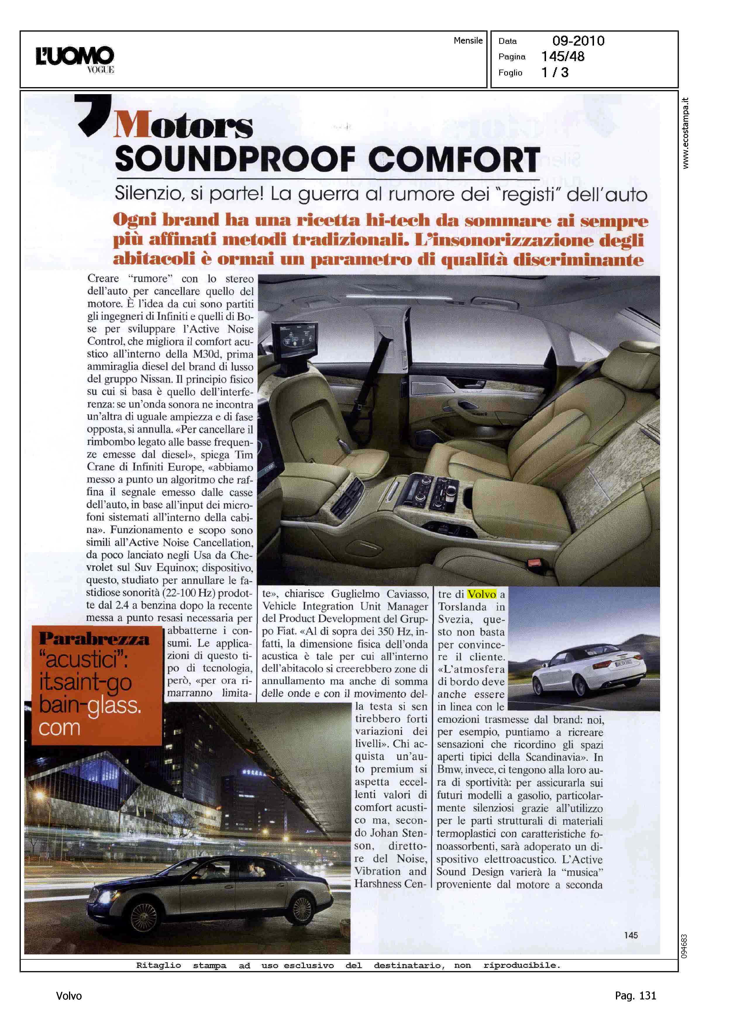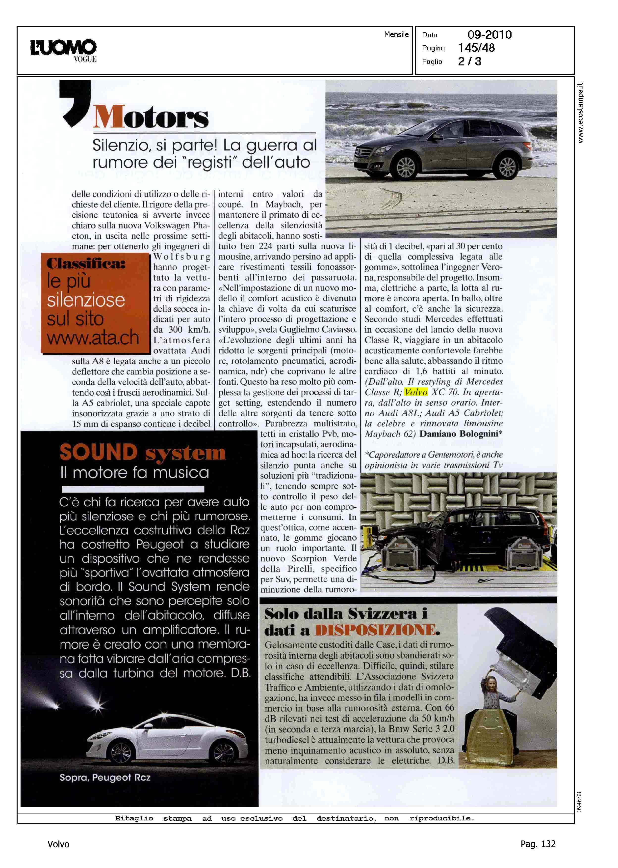 Author: BOLOGNINI, DAMIANOLine: Corporate Model: Volvo XC70 Subject: - Title: MOTORS - SOUNDPROOF COMFORTHighlight: INSONORIZZAZIONE - VOLVO XC70