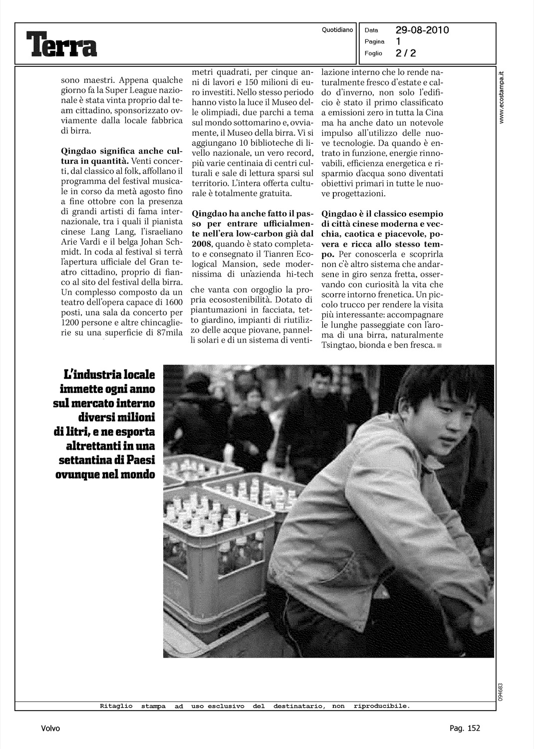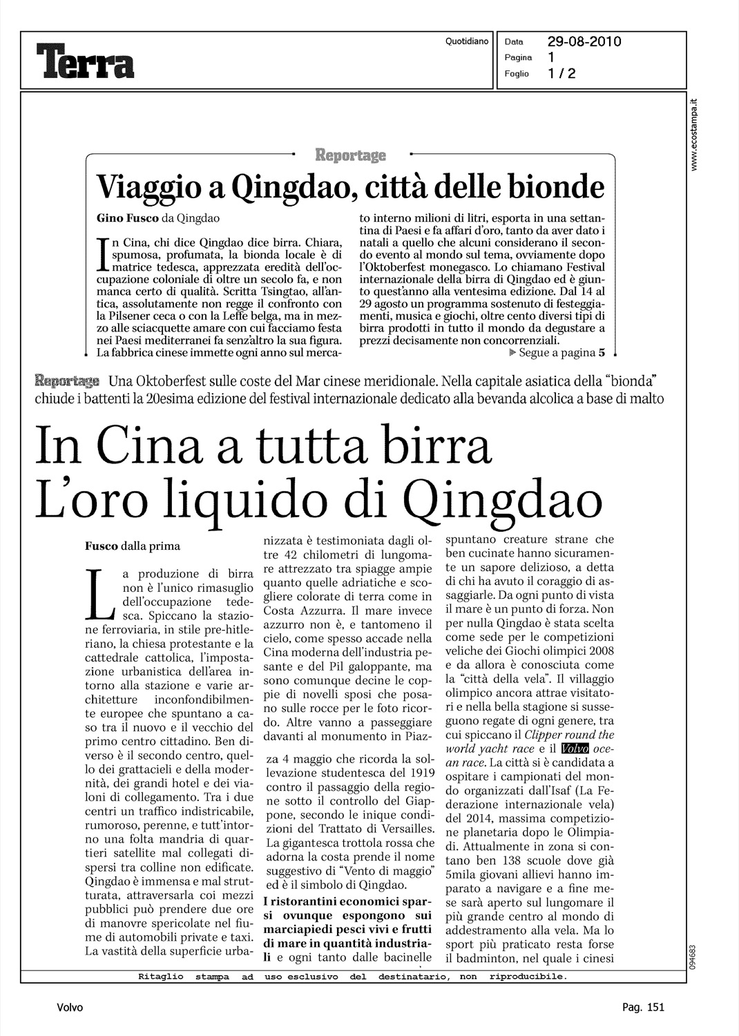 Author: FUSCO, GINOLine: Corporate Model: Corporate Subject: Volvo Ocean Race Title: IN CINA A TUTTA BIRRA - L'ORO LIQUIDO DI QINGDAOHighlight: QINGDAO - VOLVO OCEAN RACE