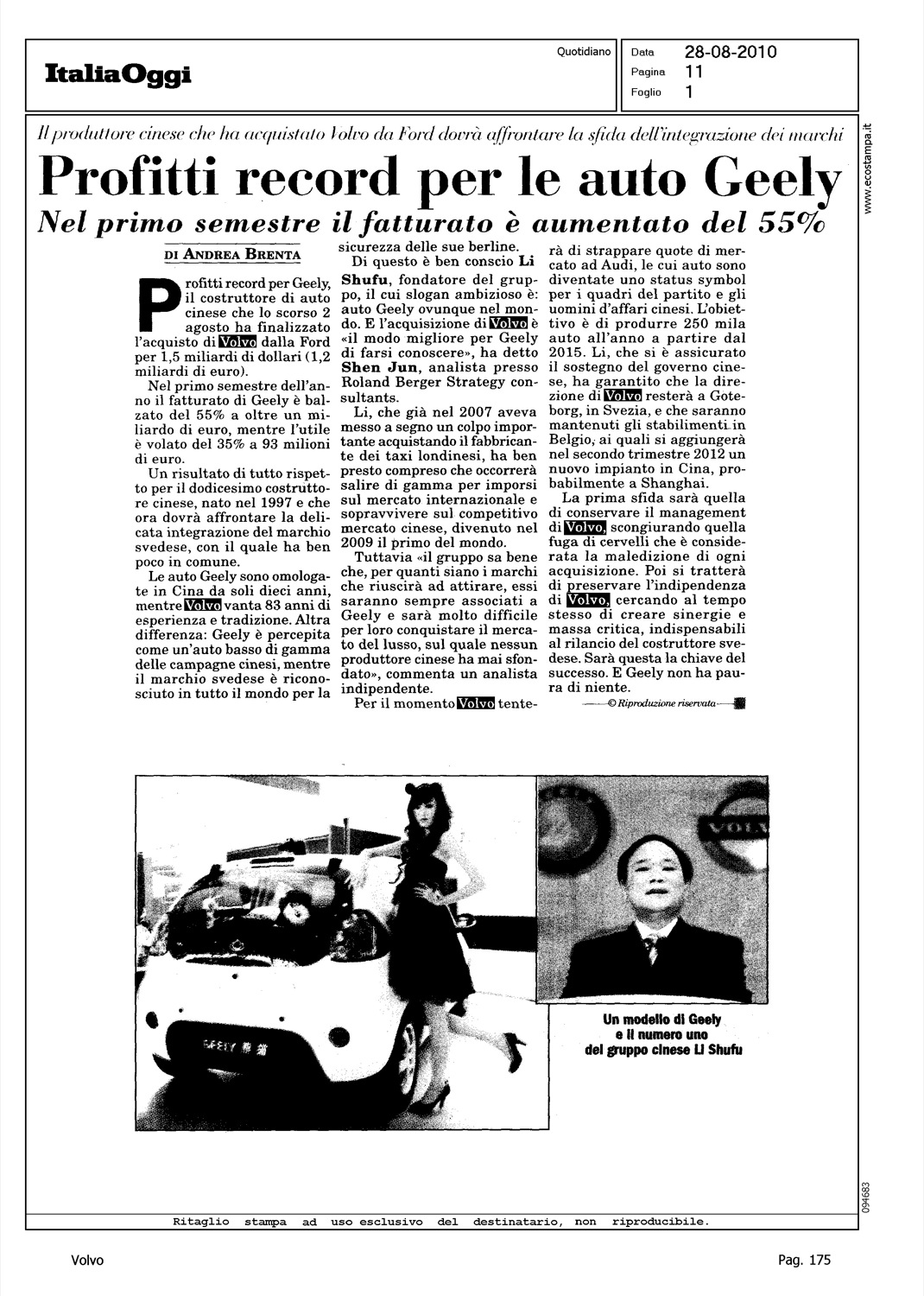 Author: BRENTA, ANDREALine: Corporate Model: Corporate Subject: - Title: PROFITTI RECORD PER LE AUTO GEELYHighlight: PROFITTI GEELY - SVILUPPO PIANO INDUSTRIALE VOLVO