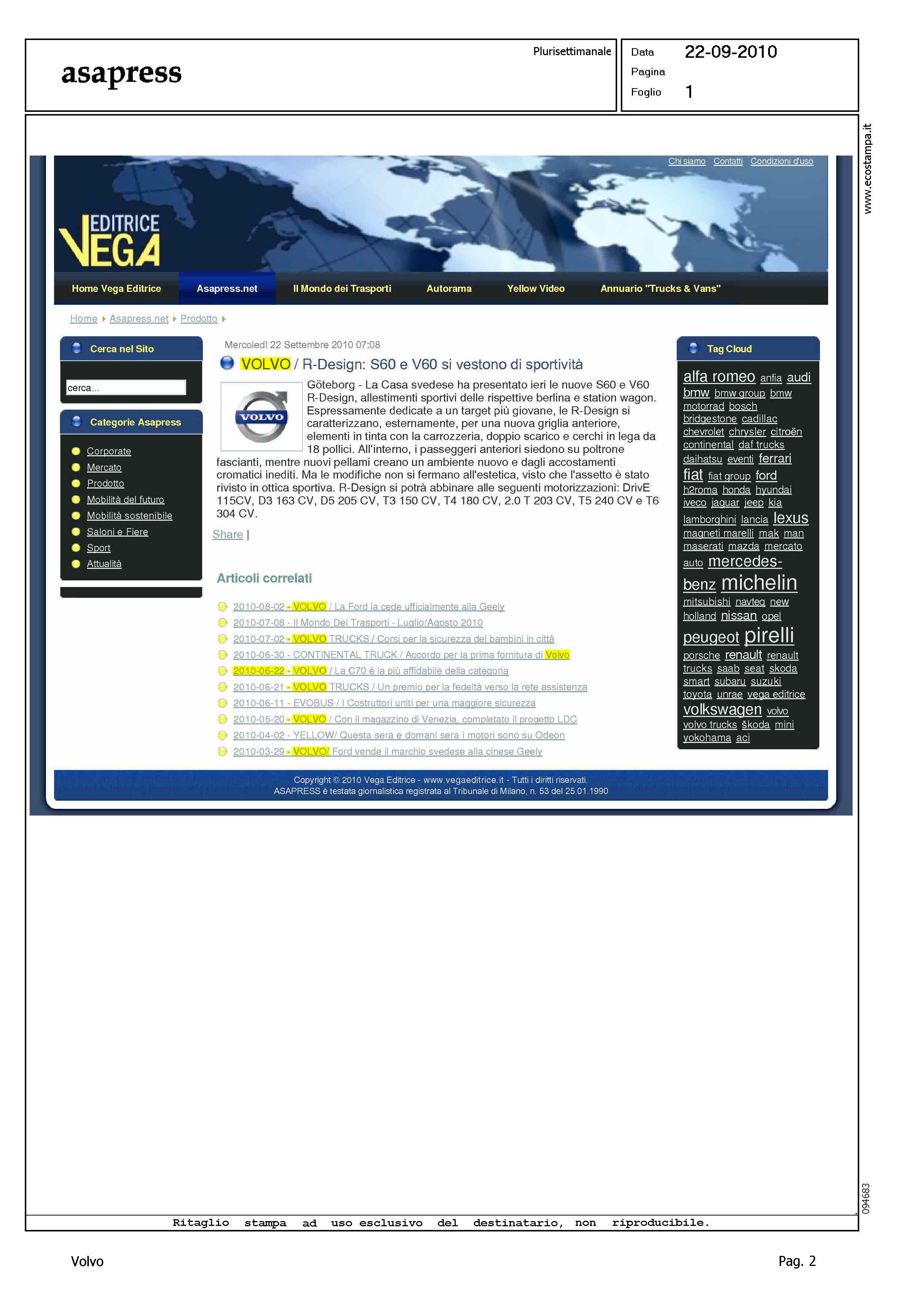 Author: Line: Corporate Model: Corporate Subject: - Title: VOLVO/R-DESIGN: S60 E V60 SI VESTONO DI SPORTIVITA'Highlight: R DESIGN - DESIGN - COLORE - ABITACOLO - MOTORI