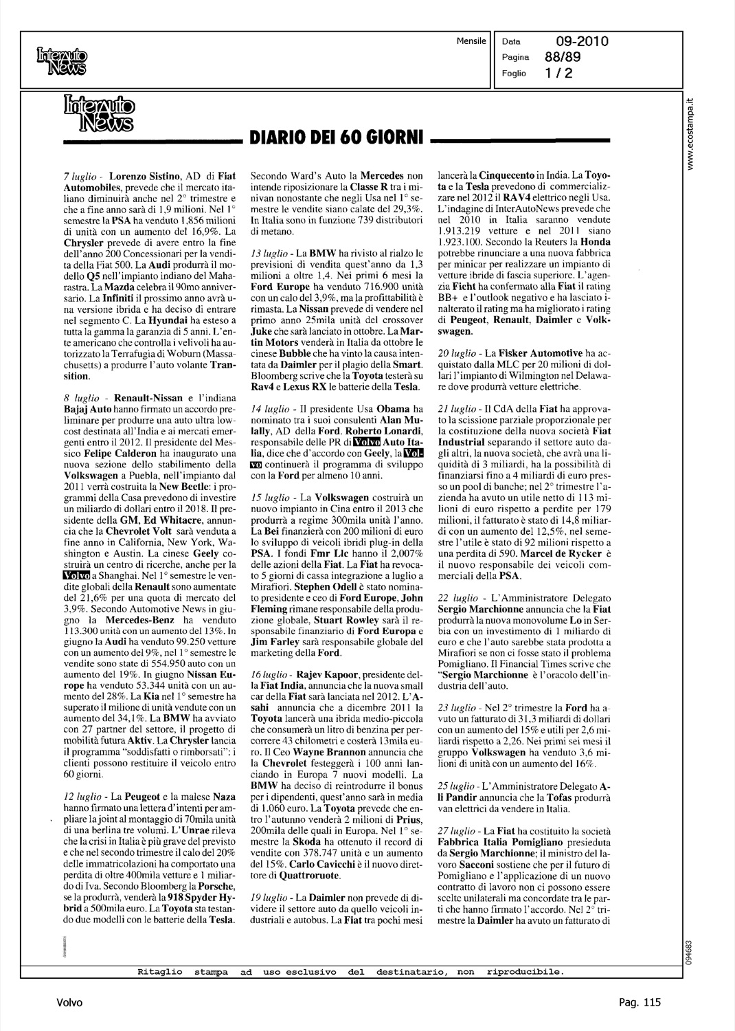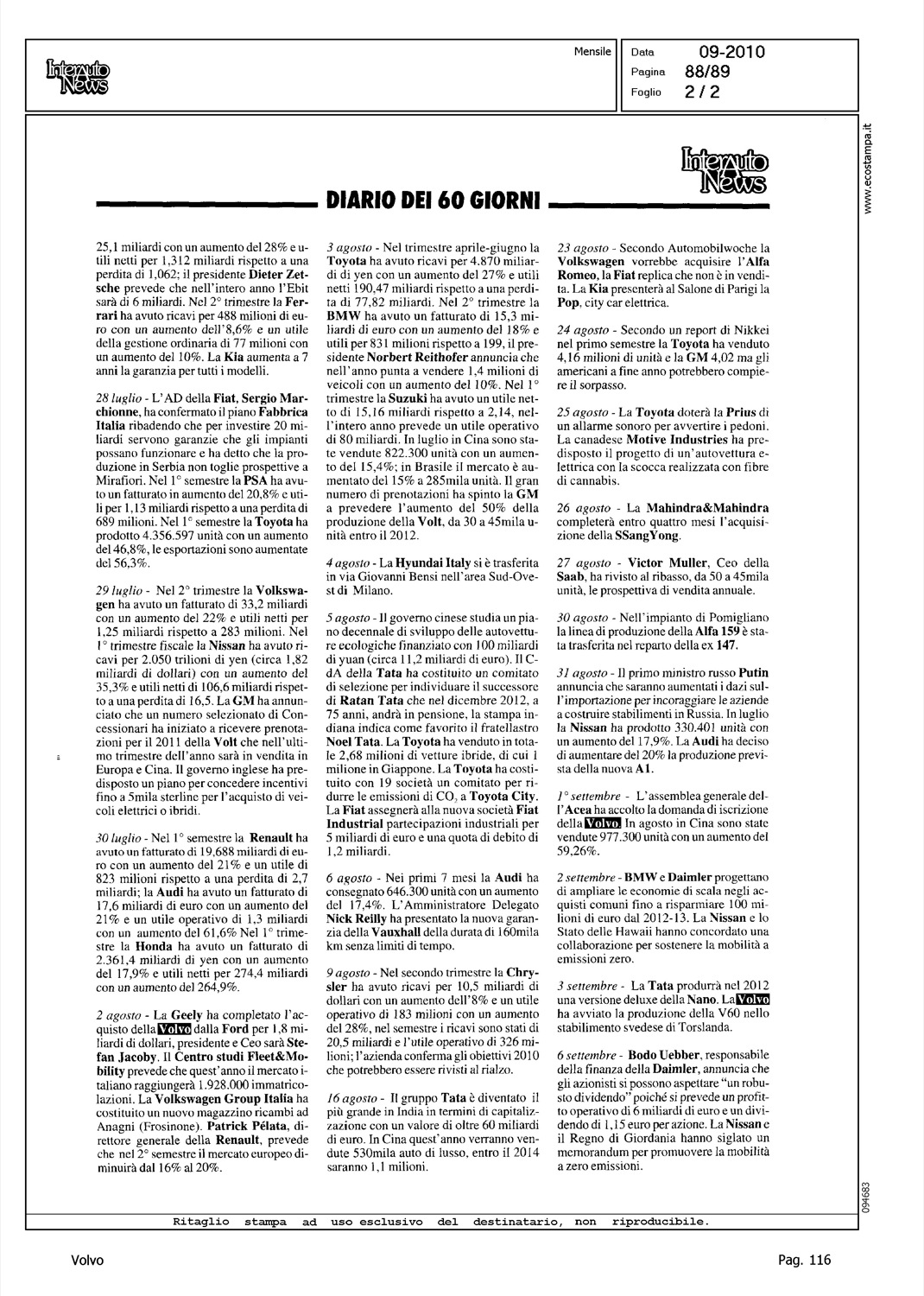 Author: Line: Corporate Model: Corporate Subject: - Title: DIARIO DEI 60 GIORNI Highlight: GEELY - CENTRO RICERCHE SHANGHAI - VOLVO - FINALIZZAZIONE PROCEDURA ACQUISTO VOLVO - V60 INIZIO PRODUZIONE TORSLANDA