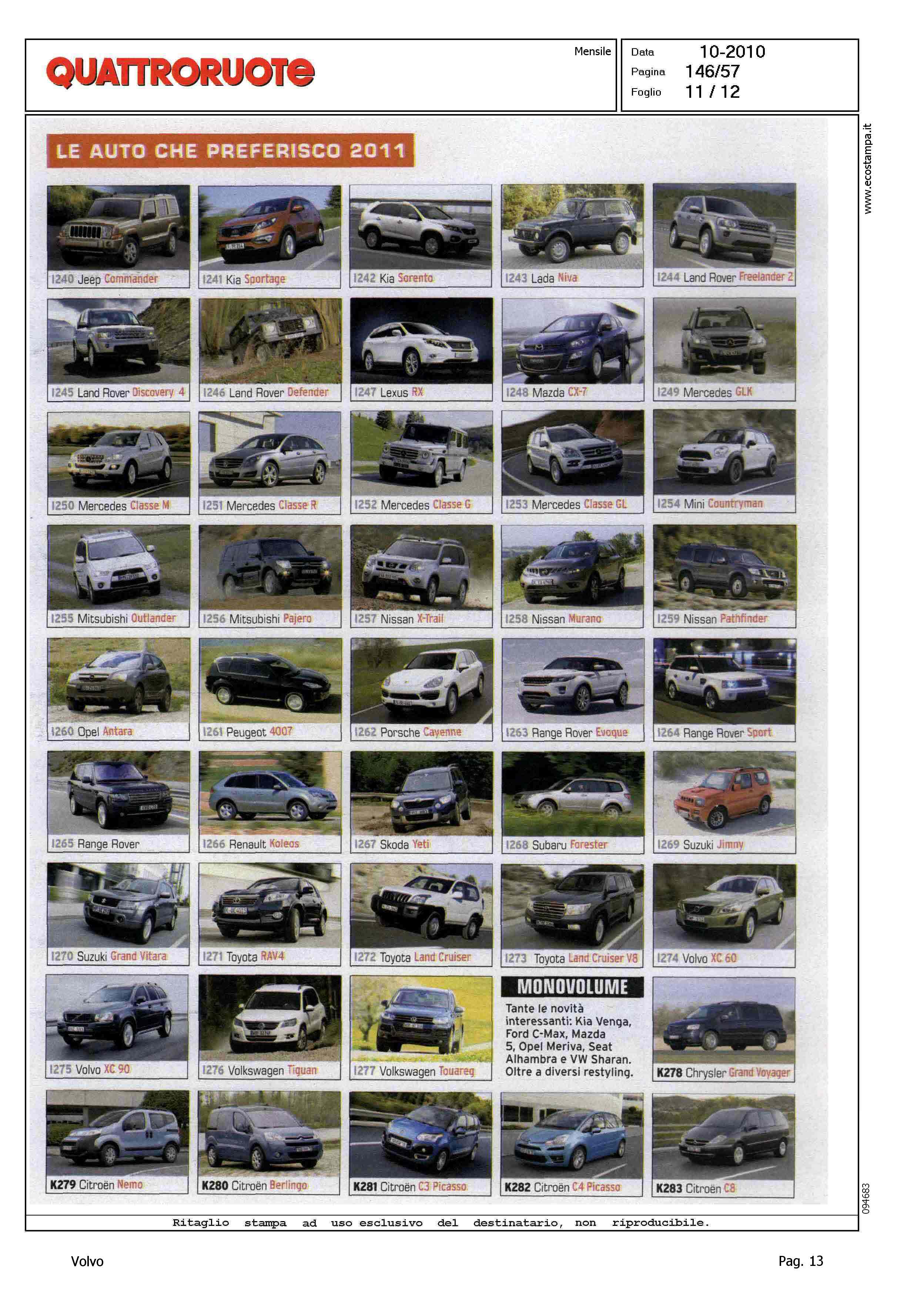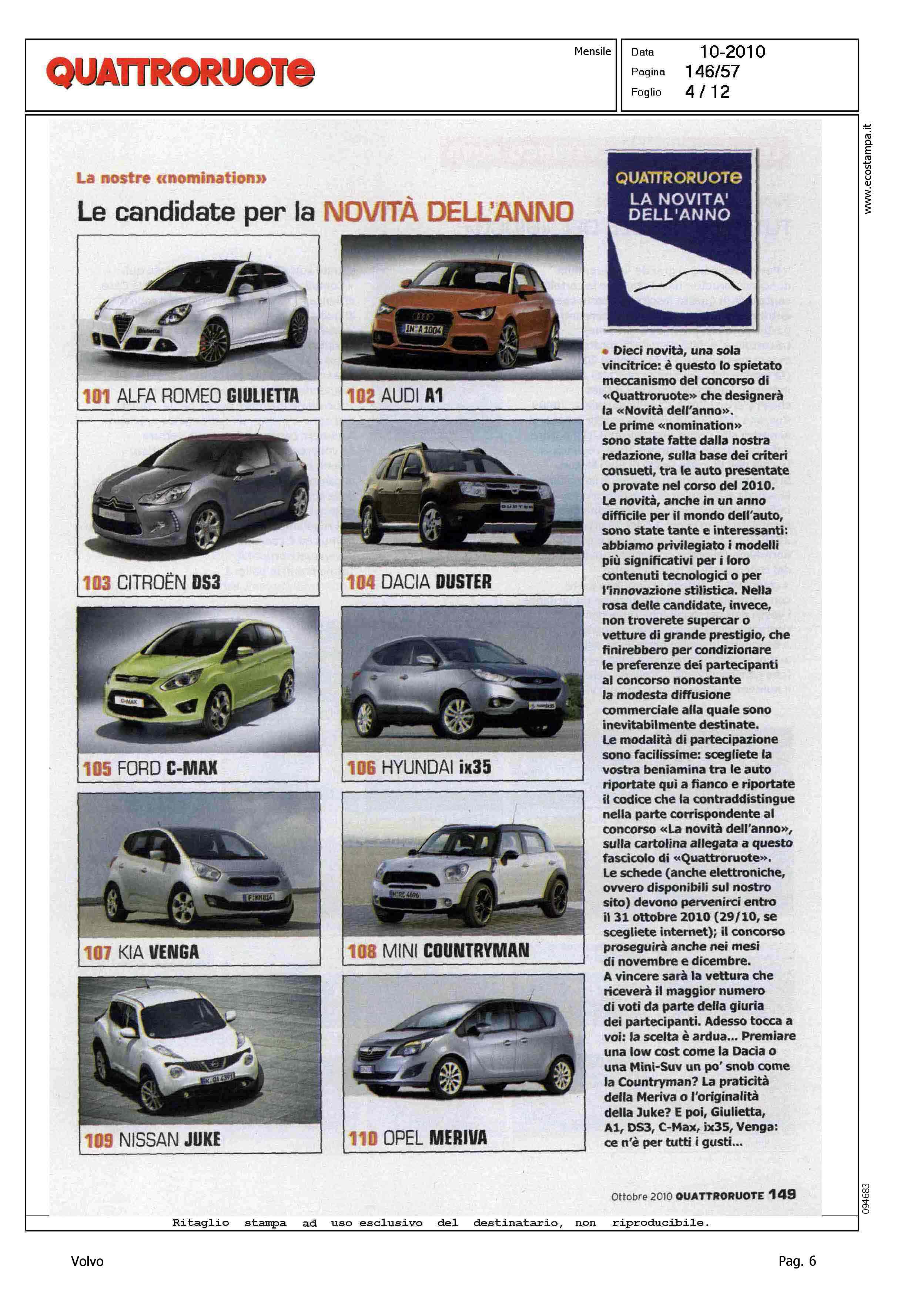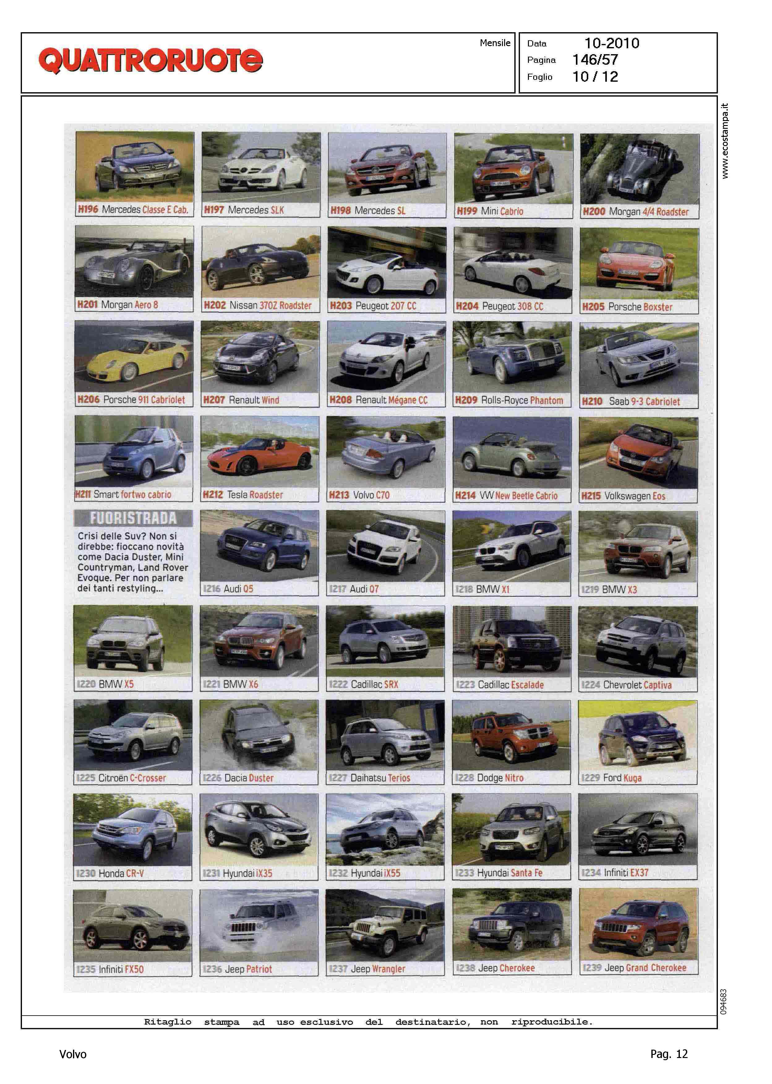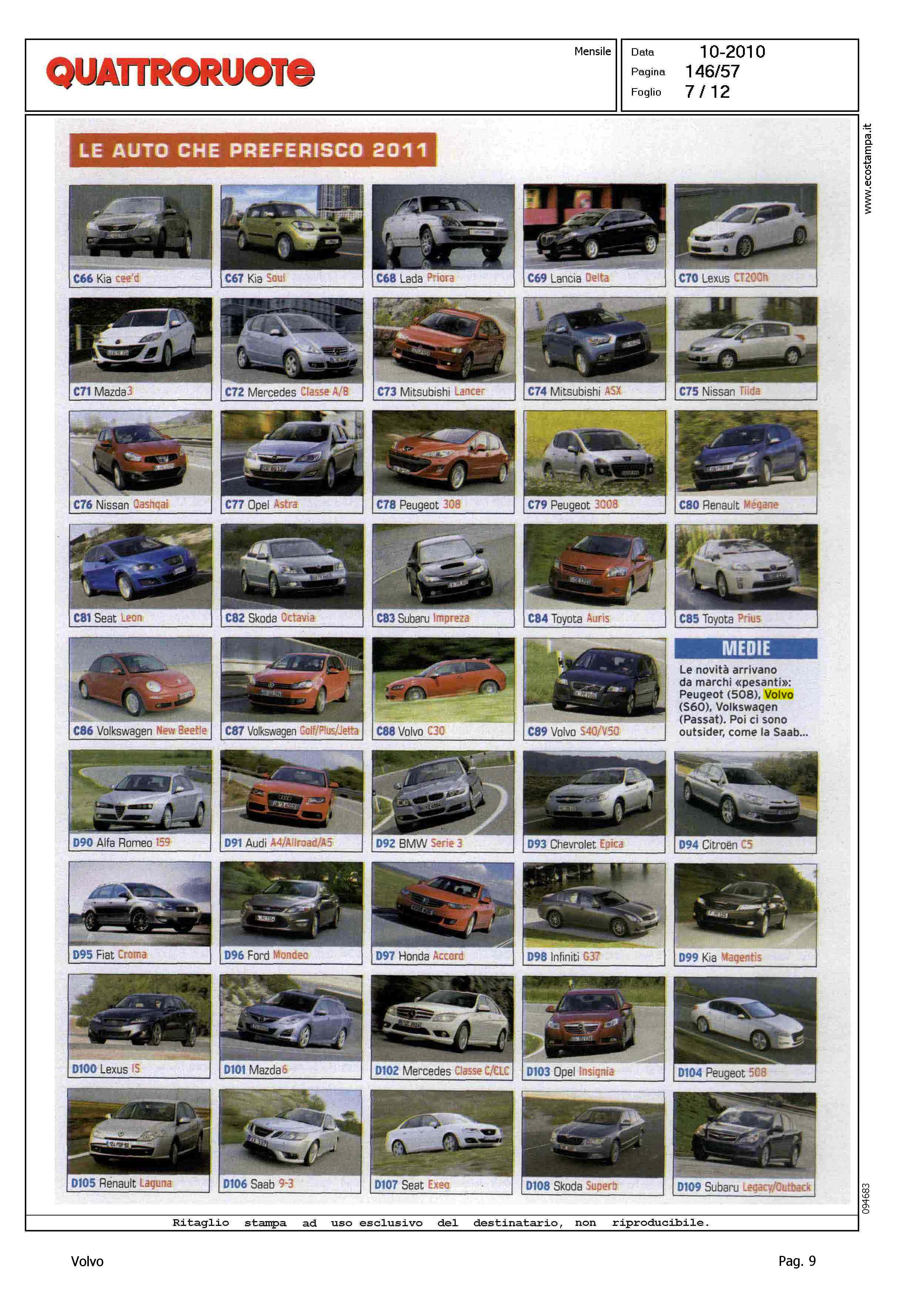 Highlight: (USCITA OTTOBRE) - SONDAGGIO LETTORI - VOTAZIONE MODELLO - PRESENZA VOLVO: CATEGORIA MEDIO-PICCOLE, VOLVO C30, VOLVO S40/V50 - CATEGORIA MEDIE, VOLVO S60 - CATEGORIA MEDIO-GRANDI, VOLVO S60, VOLVO XC70, VOLVO V70 - CATEGORIA CABRIO, VOLVO C70 CONV. - CATEGORIA FUORISTRADA, VOLVO XC60, VOLVO XC90
