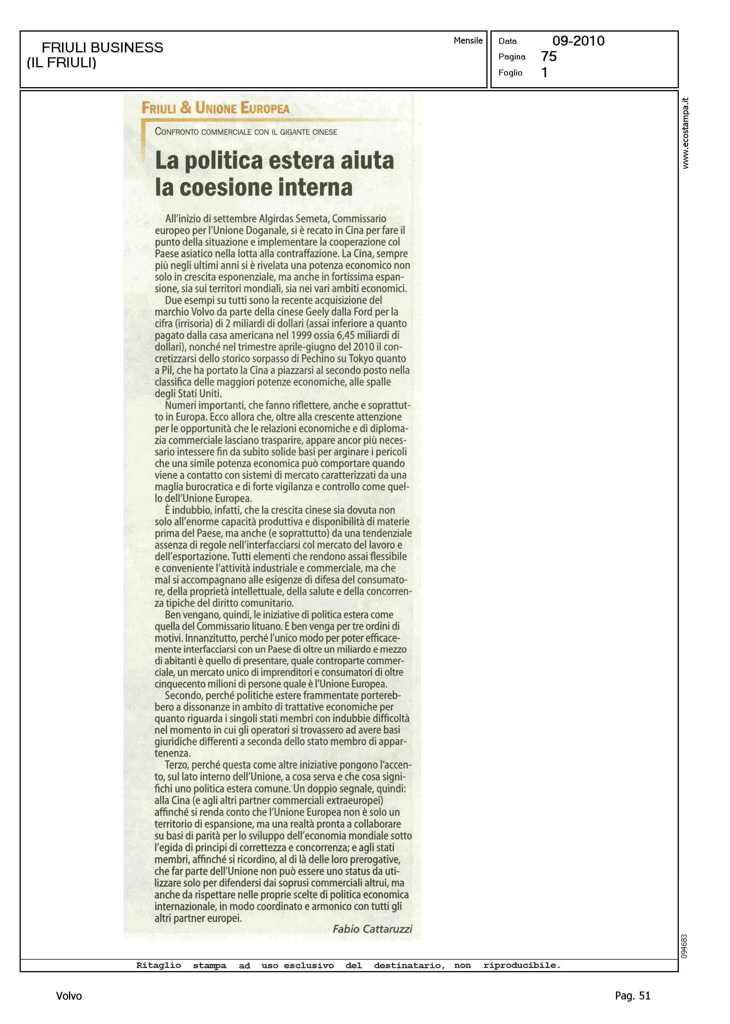 Author: CATTARUZZI, FABIOLine: Corporate Model: Corporate Subject: - Title: LA POLITICA ESTERA AIUTA LA COESIONE INTERNAHighlight: (EDIZIONE FRIULI BUSINESS) - GEELY - VOLVO