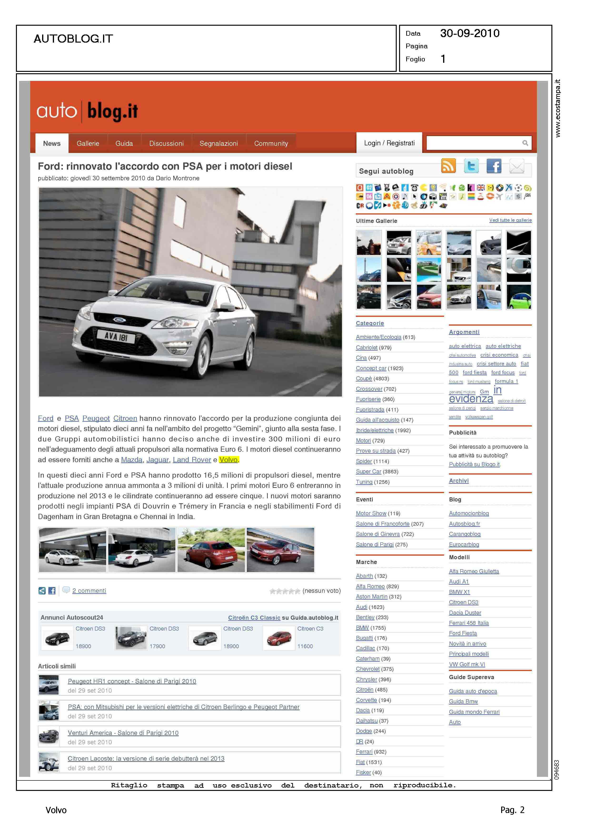 Author: Line: Corporate Model: Corporate Subject: - Title: FORD: RINNOVATO L'ACCORDO CON PSA PER I MOTORI DIESELHighlight: MOTORI - PSA - FORD - FORNITURA MOTORI DIESEL - VOLVO