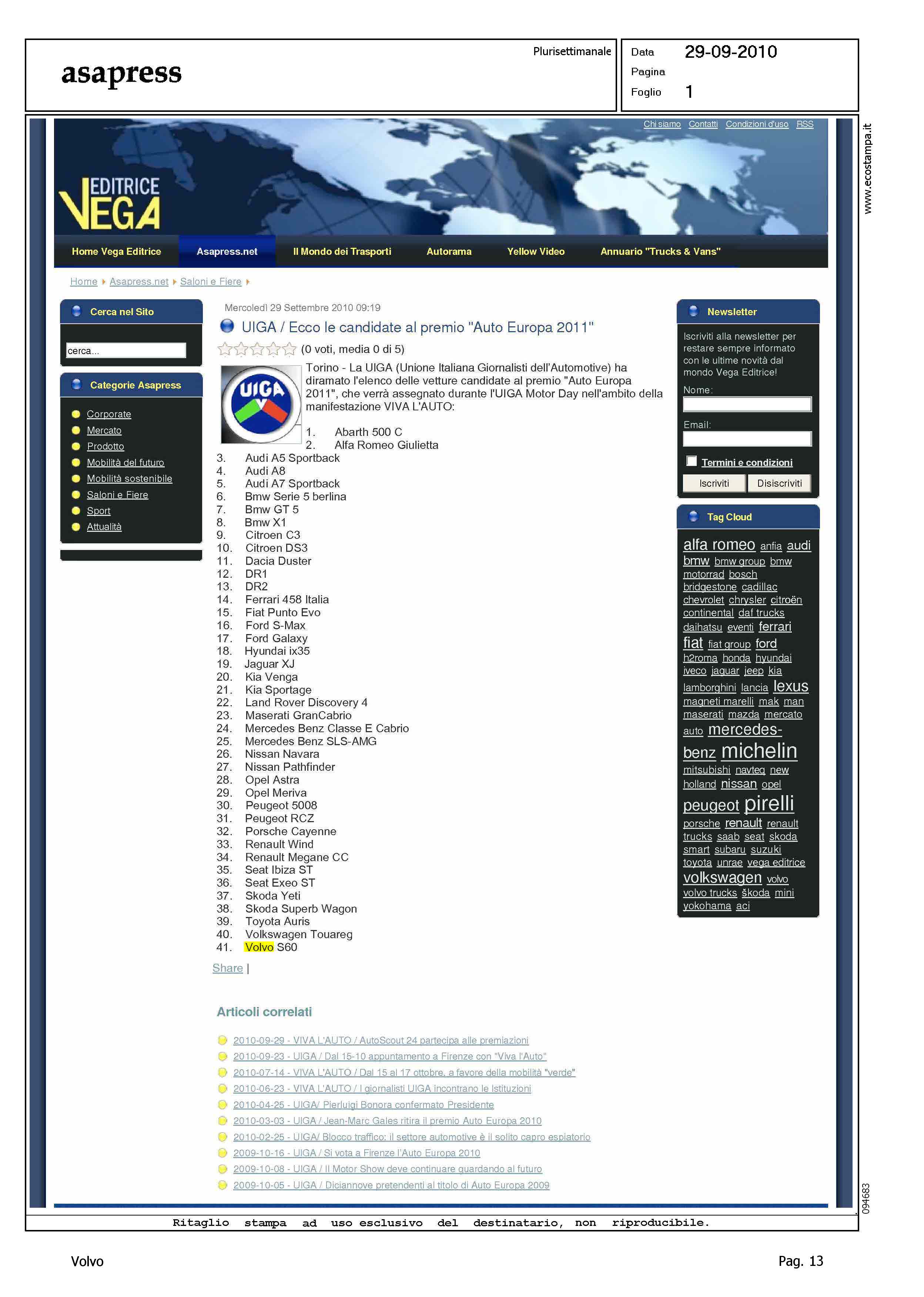 Author: Line: Corporate Model: Corporate Subject: - Title: UIGA/ECCO LE CANDIDATE AL PREMIO "AUTO EUROPA 2011"Highlight: UIGA - AUTO EUROPA 2011 - VOLVO S60 - ELENCO CANDIDATE