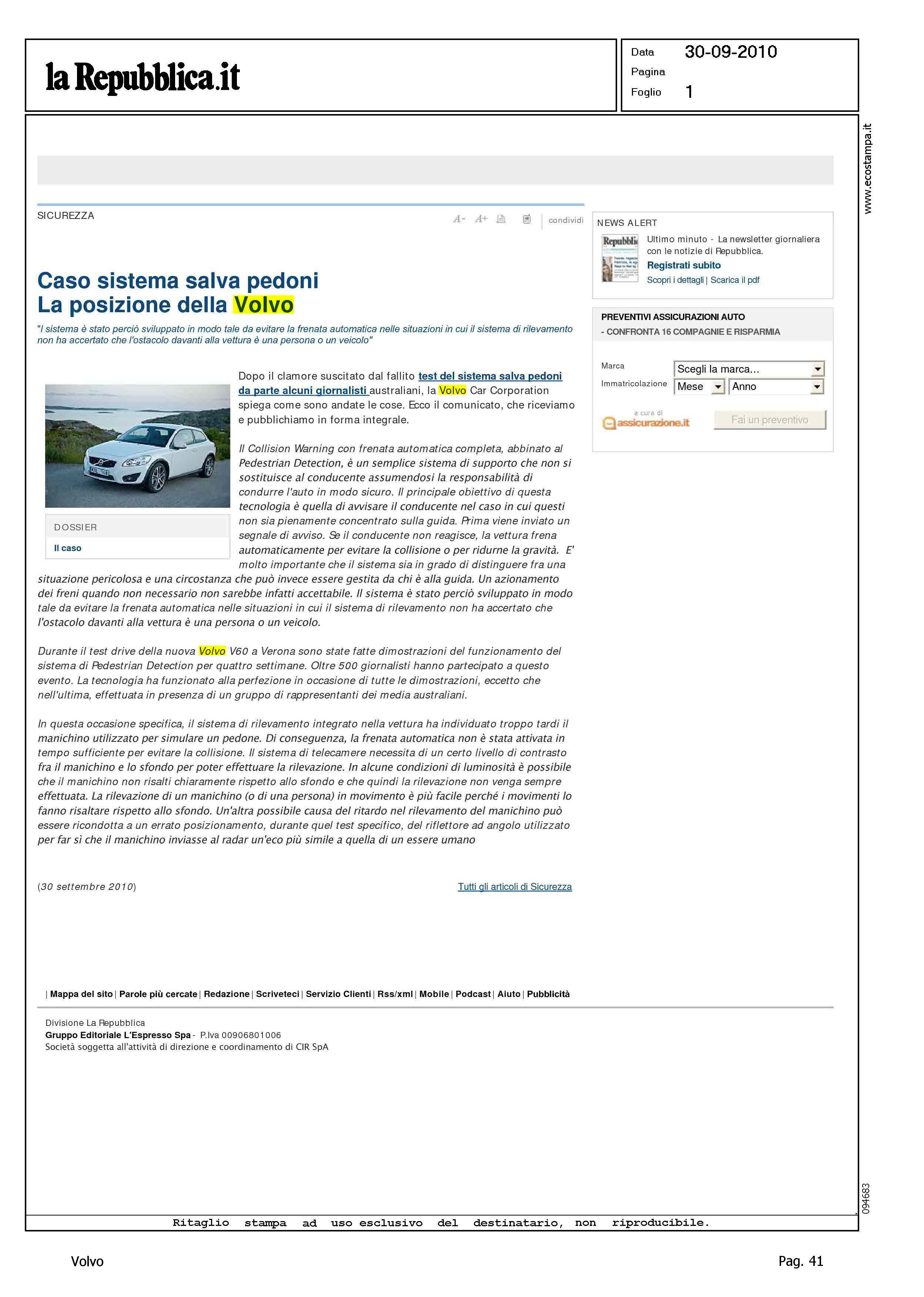 Author: Line: Corporate Model: Corporate Subject: - Title: CASO SISTEMA SALVA PEDONI - LA POSIZIONE DELLA VOLVOHighlight: PEDESTRIAN DETECTION, ERRORE NEL TEST - POSIZIONE UFFICIALE VOLVO AUTO