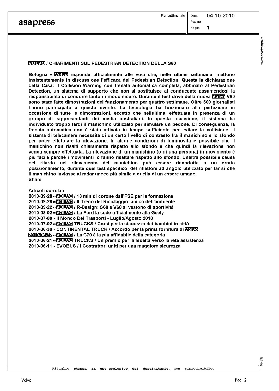 Author: Line: Corporate Model: Corporate Subject: - Title: VOLVO/CHIARIMENTI SUL PEDESTRIAN DETECTION DELLA S60Highlight: PEDESTRIAN DETECTION - DICHIARAZIONE UFFICIALE VOLVO