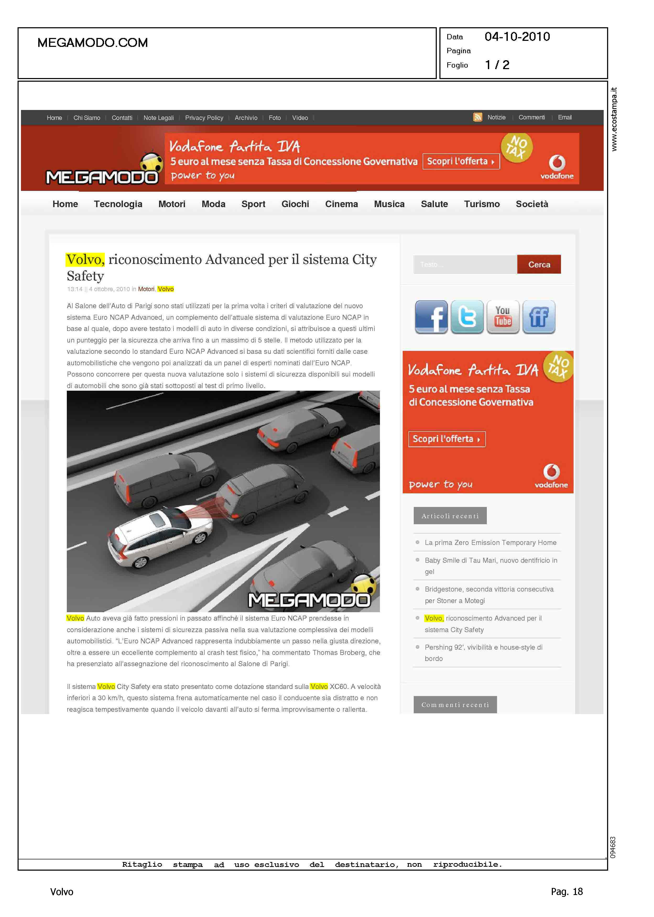 Title: VOLVO, RICONOSCIMENTO ADVANCED PER IL SISTEMA CITY SAFETY