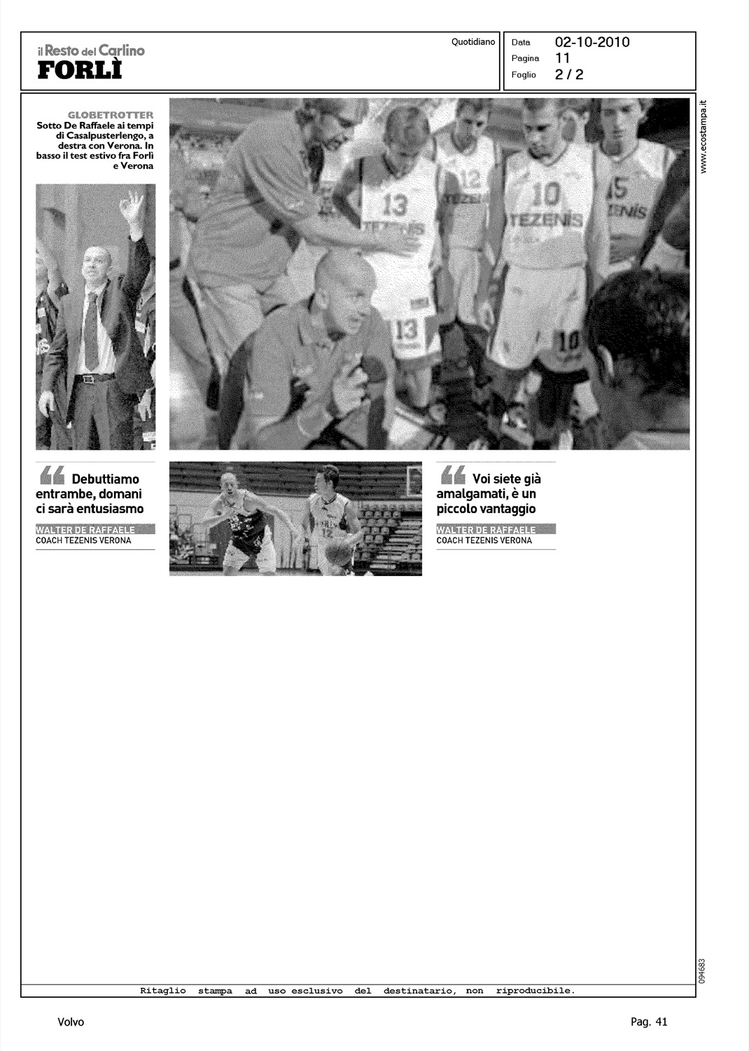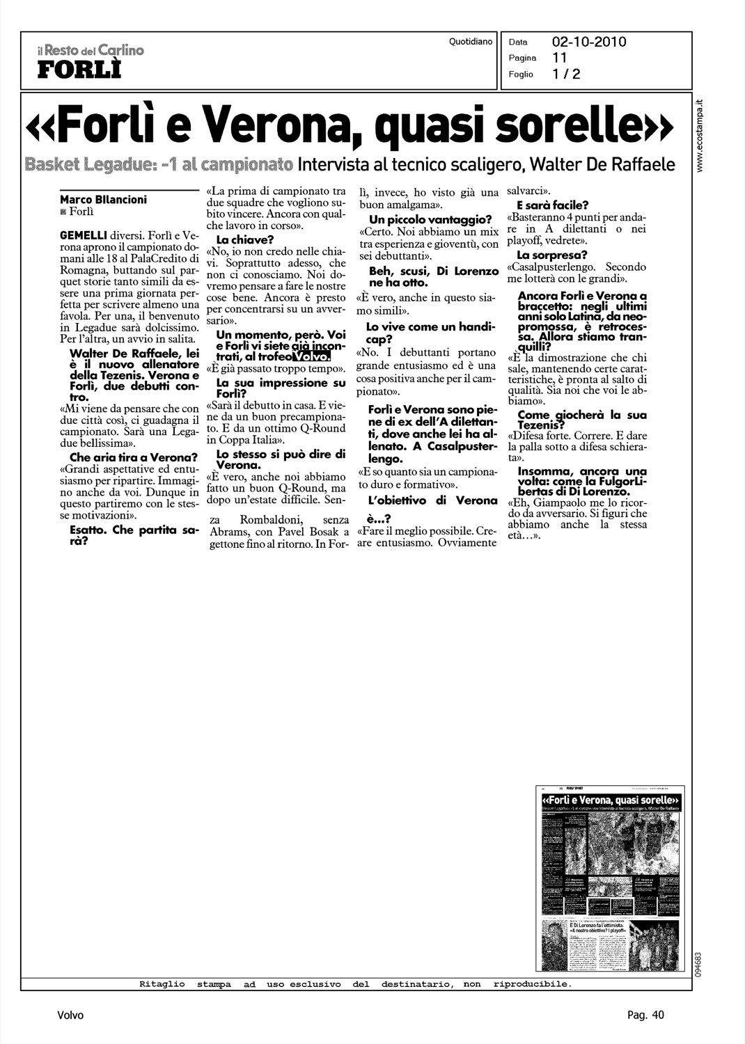 Author: BILANCIONI, MARCOLine: Corporate Model: Corporate Subject: - Title: "FORLI' E VERONA, QUASI SORELLE"Highlight: (EDIZIONE FORLI) - BASKET LEGADUE - TROFEO VOLVO