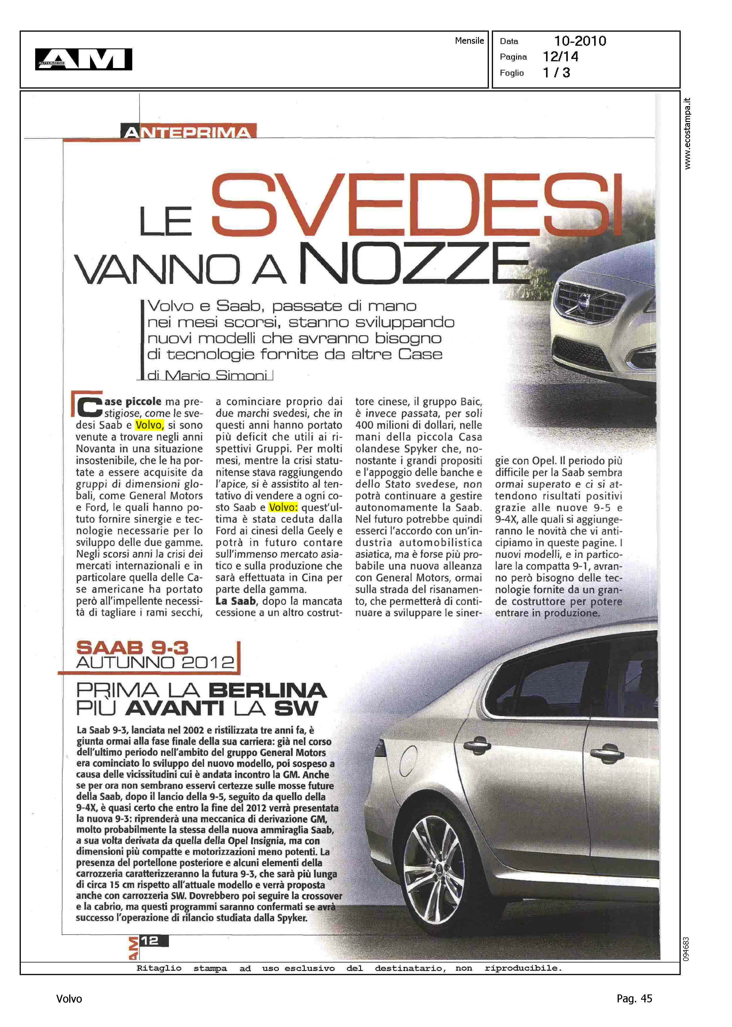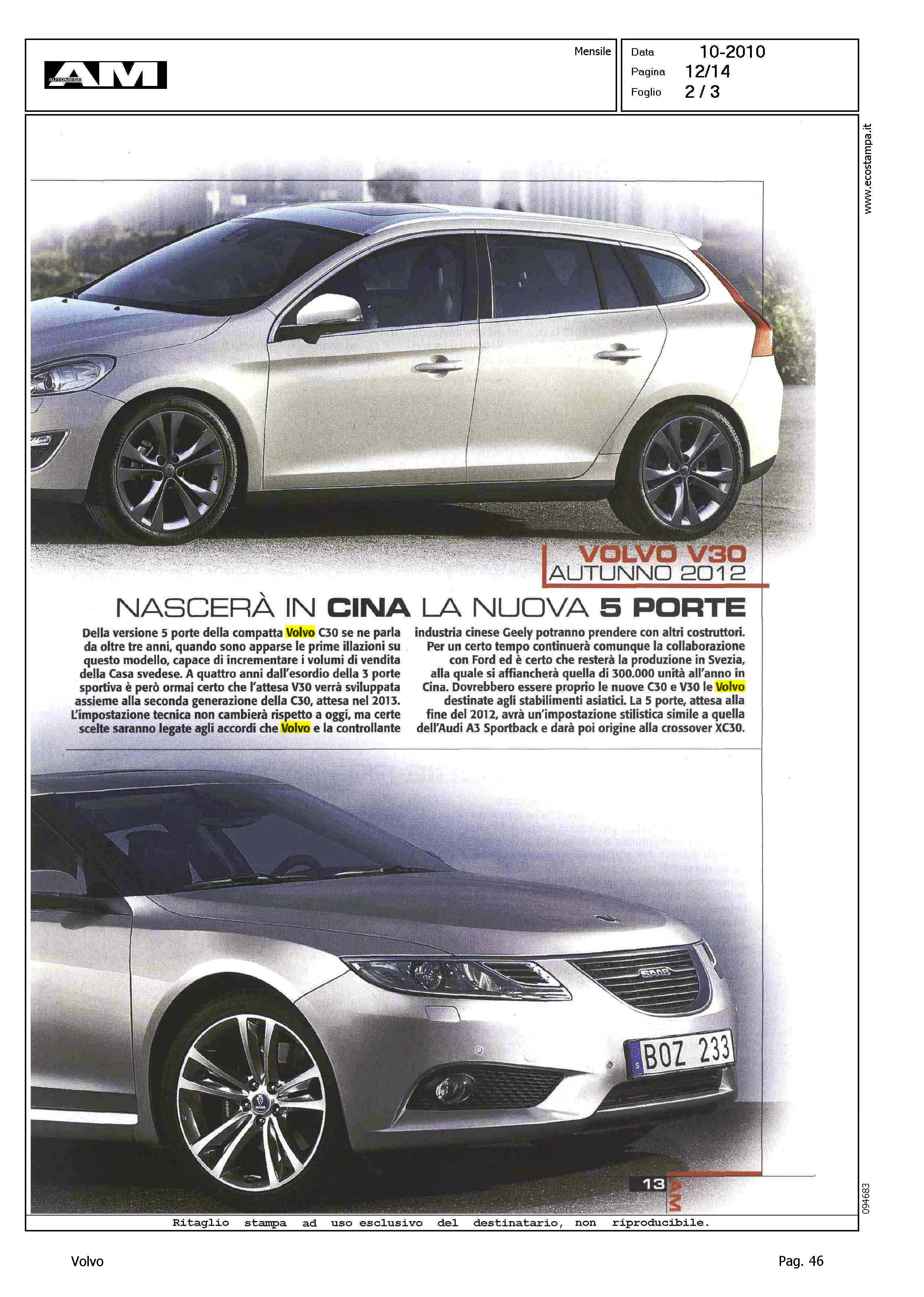 Title: LE SVEDESI VANNO A NOZZE - VOLVO V30, AUTUNNO 2012, NASCERA' IN CINA LA NUOVA 5 PORTE - VOLVO C70, ESTATE 2012, NUOVE TECNOLOGIE PER LA CABRIOLET