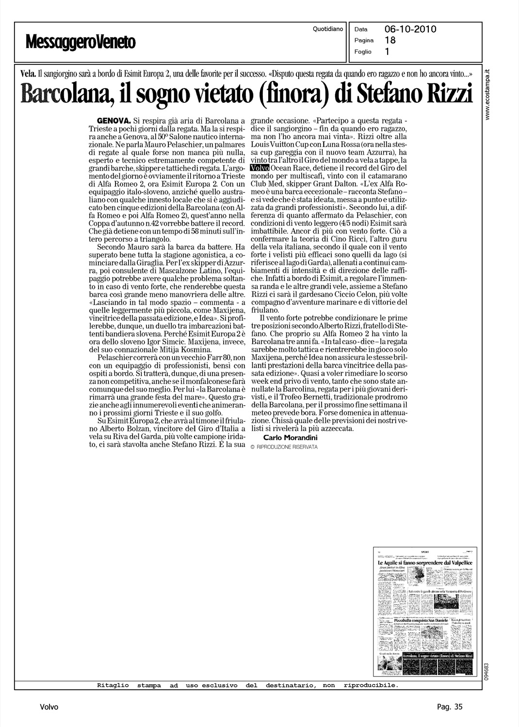 Author: MORANDINI, CARLOLine: Corporate Model: Corporate Subject: Volvo Ocean Race Title: BARCOLANA, IL SOGNO VIETATO (FINORA) DI STEFANO RIZZIHighlight: REGATA DI TRIESTE - STEFANO RIZZI - VOLVO OCEAN RACE