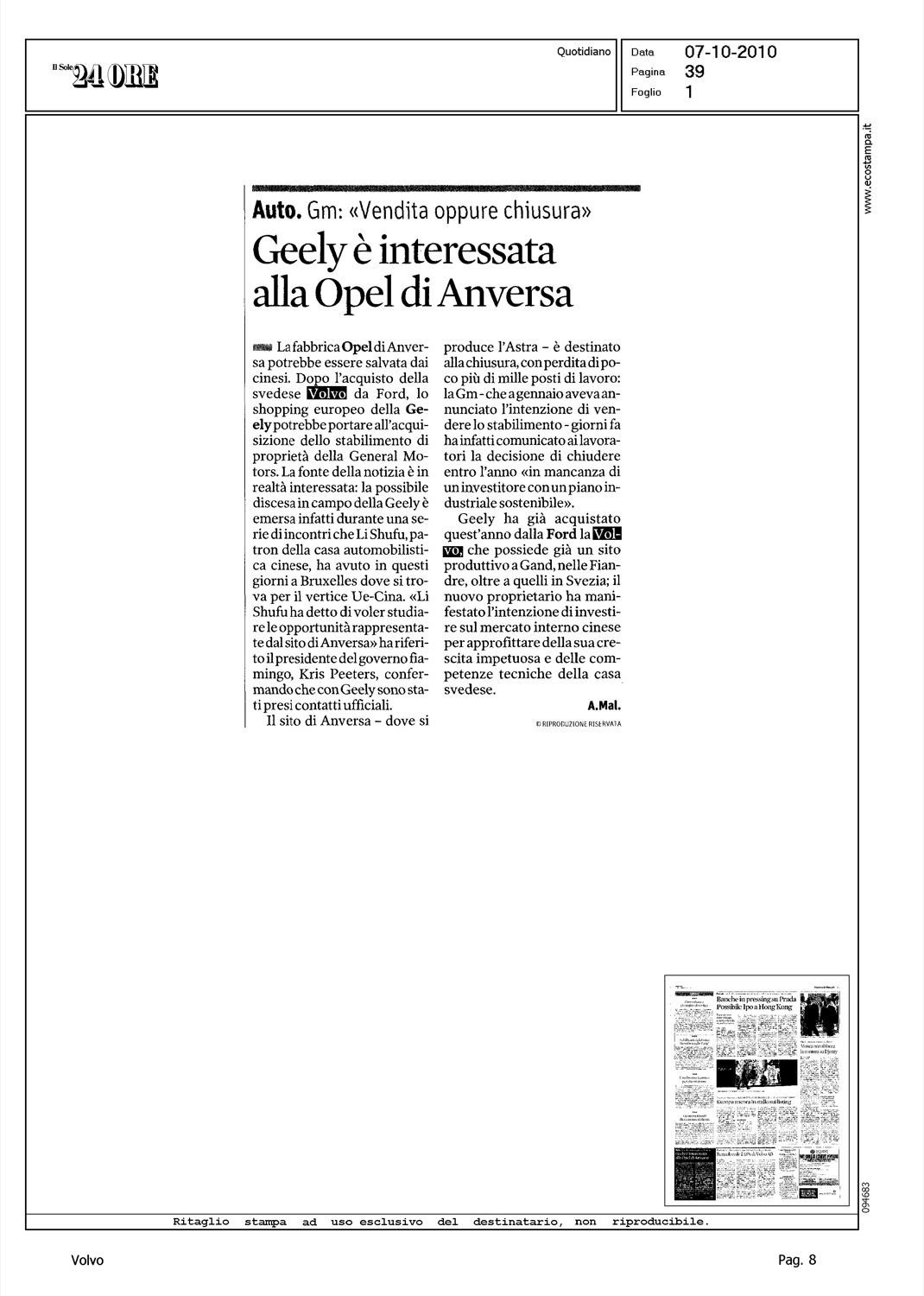 Author: MALAN, ANDREALine: Corporate Model: Corporate Subject: - Title: GEELY E' INTERESSATA ALLA OPEL DI ANVERSAHighlight: GEELY - ANVERSA