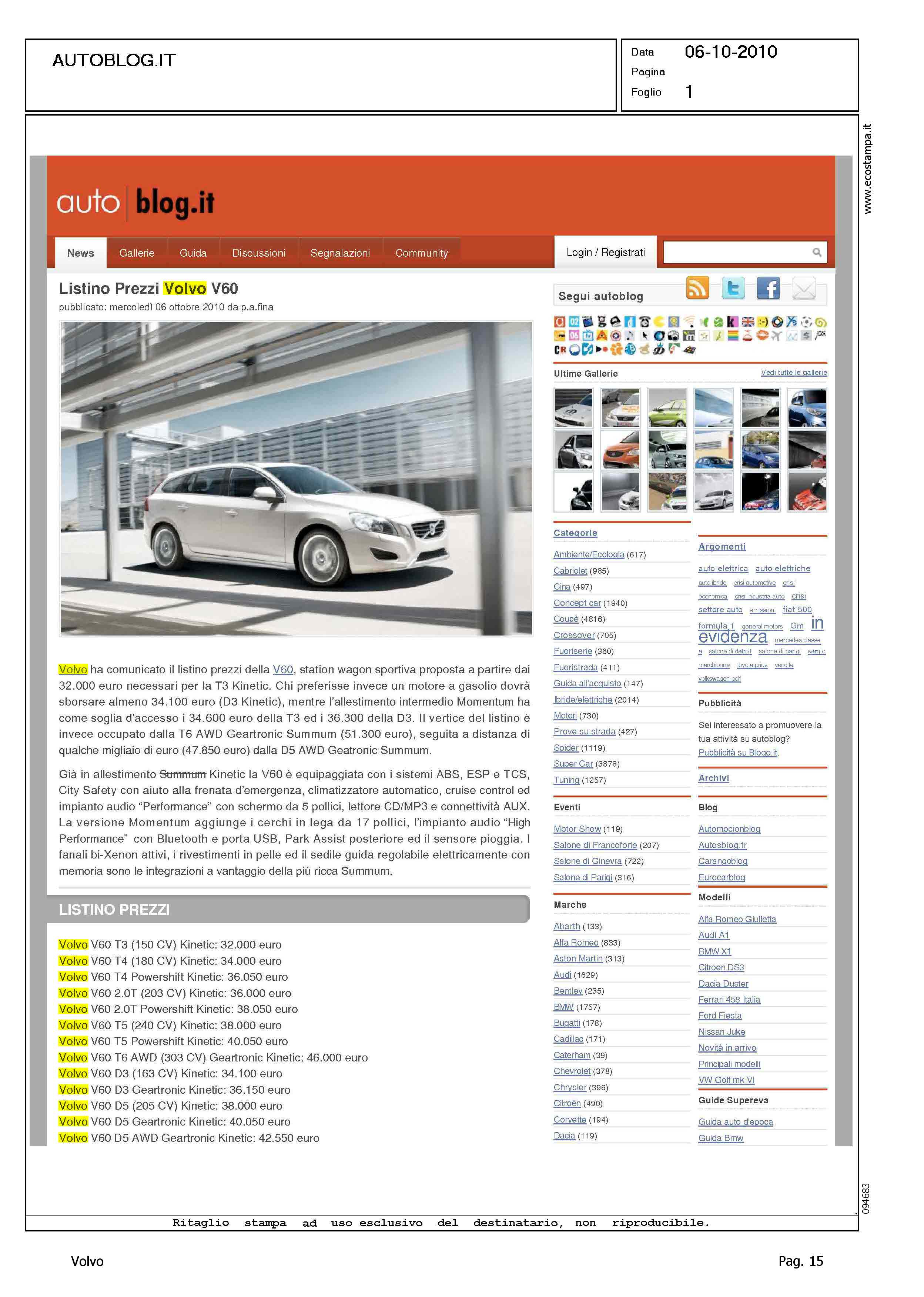 Author: Line: Corporate Model: Corporate Subject: - Title: LISTINO PREZZI VOLVO V60Highlight: VOLVO V60 - LISTINO PREZZI - MOTORI - ALLESTIMENTI - ACCESSORI