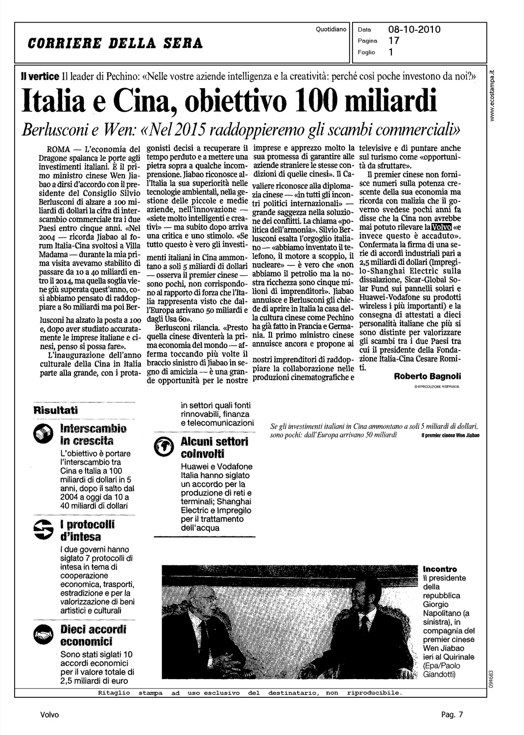Author: BAGNOLI, ROBERTOLine: Corporate Model: Corporate Subject: - Title: ITALIA E CINA, OBIETTIVO 100 MILIARDIHighlight: JIABAO SU VOLVO-GEELY