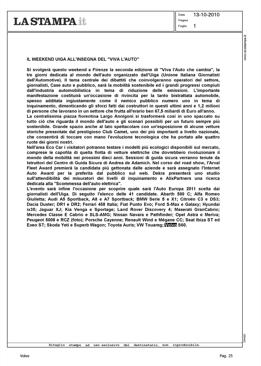 Author: Line: S60 Model: Linea S60 Testdrive Subject: - Title: IL WEEKEND UIGA ALL'INSEGNA DEL "VIVA L'AUTO"Highlight: UIGA - AUTO EUROPA 2011