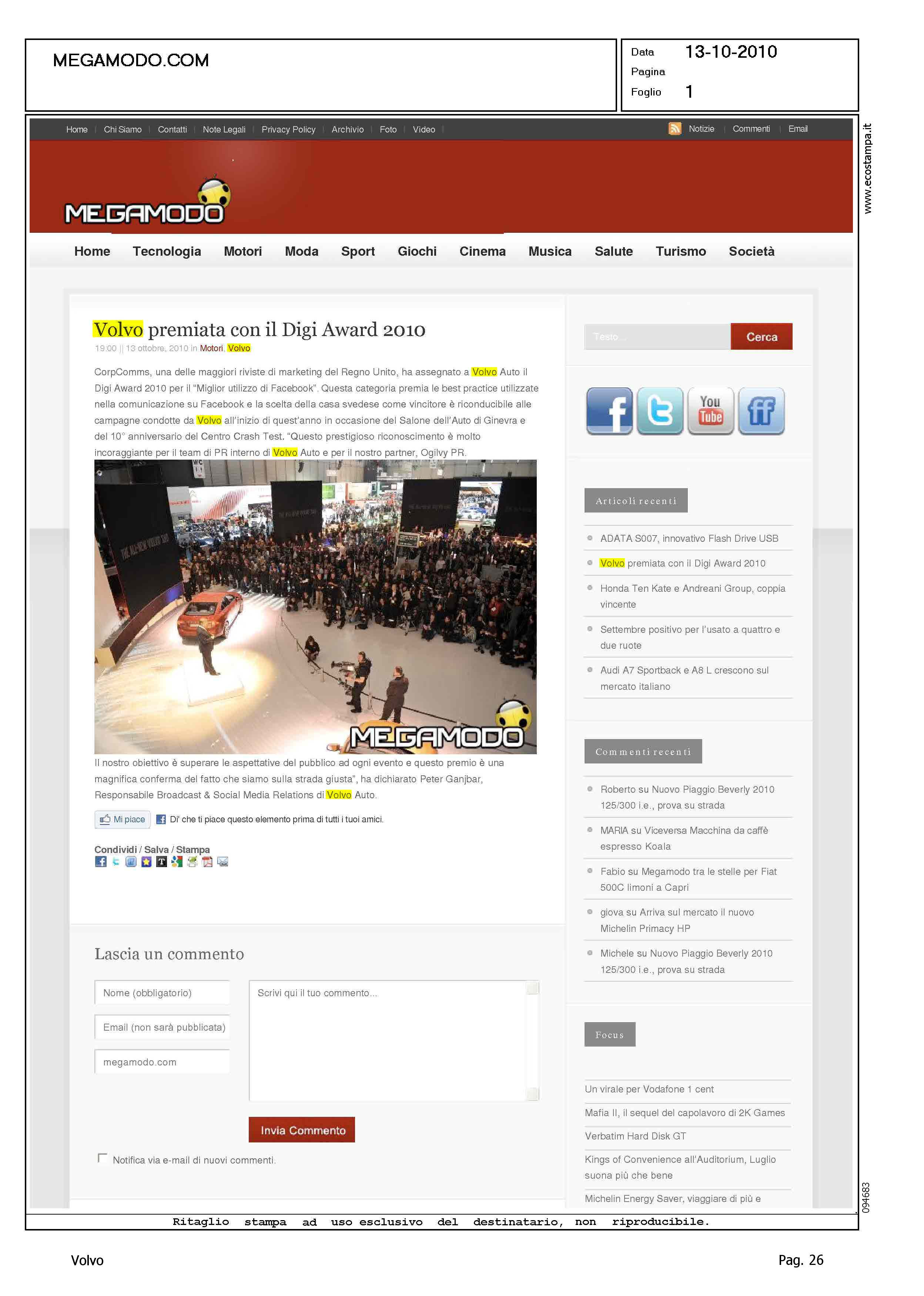 Author: Line: Corporate Model: Corporate Subject: - Title: VOLVO PREMIATA CON IL DIGI AWARD 2010Highlight: MARKETING - VOLVO - DIGI AWARD 2010