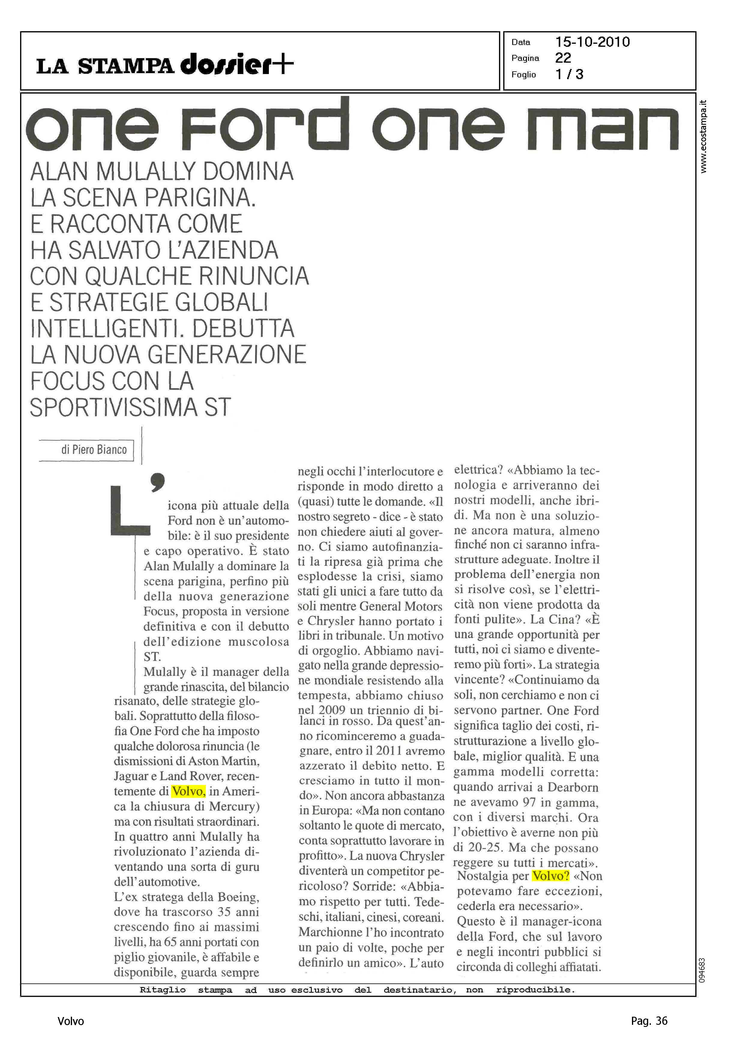 Author: BIANCO, PIEROLine: Corporate Model: Corporate Subject: - Title: ONE FORD ONE MANHighlight: INTERVISTA MULALLY - GEELY, CESSIONE VOLVO