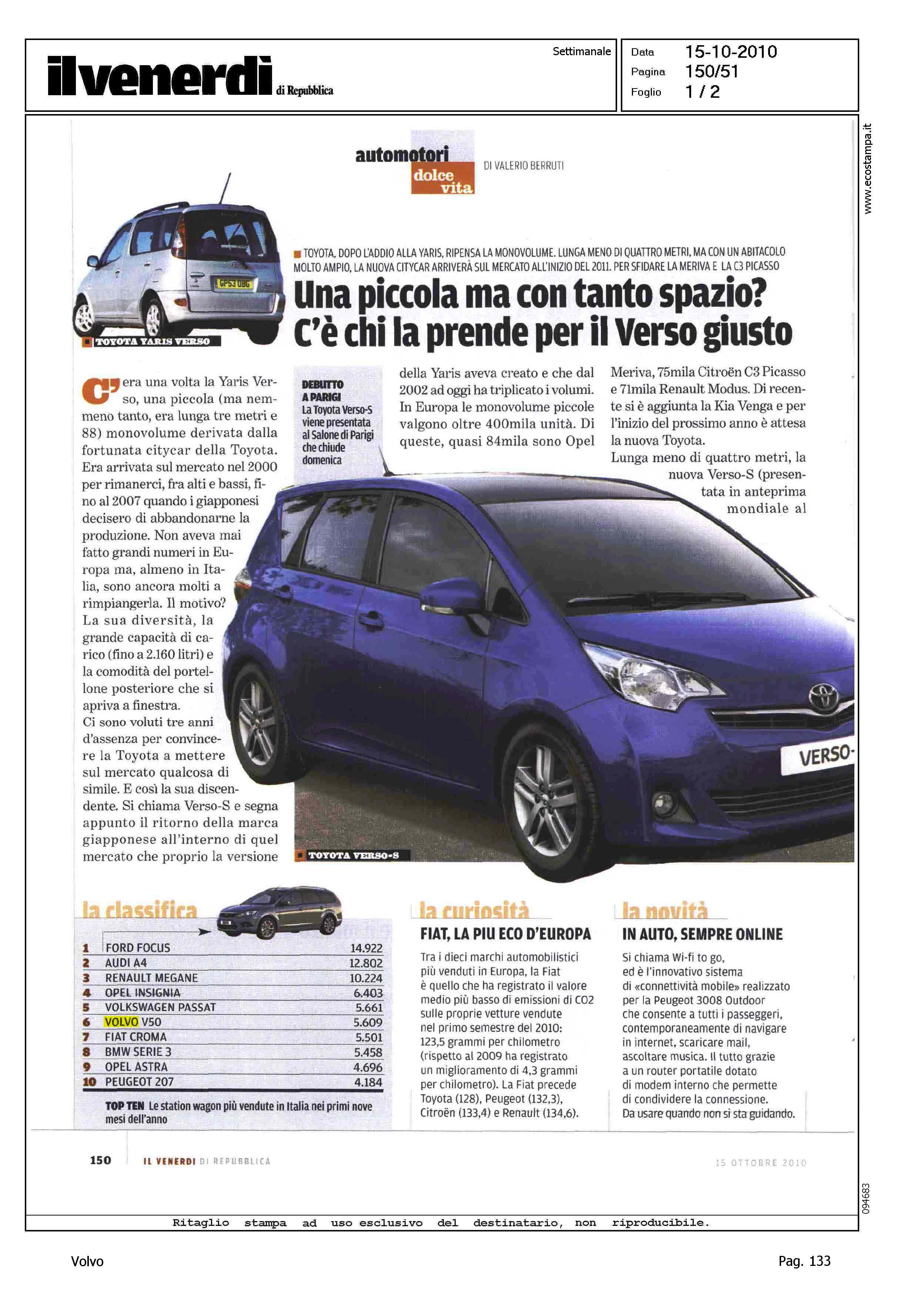 Author: BERRUTI, VALERIOLine: Corporate Model: Volvo S40 - V50 Subject: - Title: LA CLASSIFICAHighlight: MERCATO ITALIA - TABELLA CLASSIFICA STATION WAGON, 9 MESI 2010 - POSIZIONE VOLVO V50, 6/10, 5.609 UNITA'