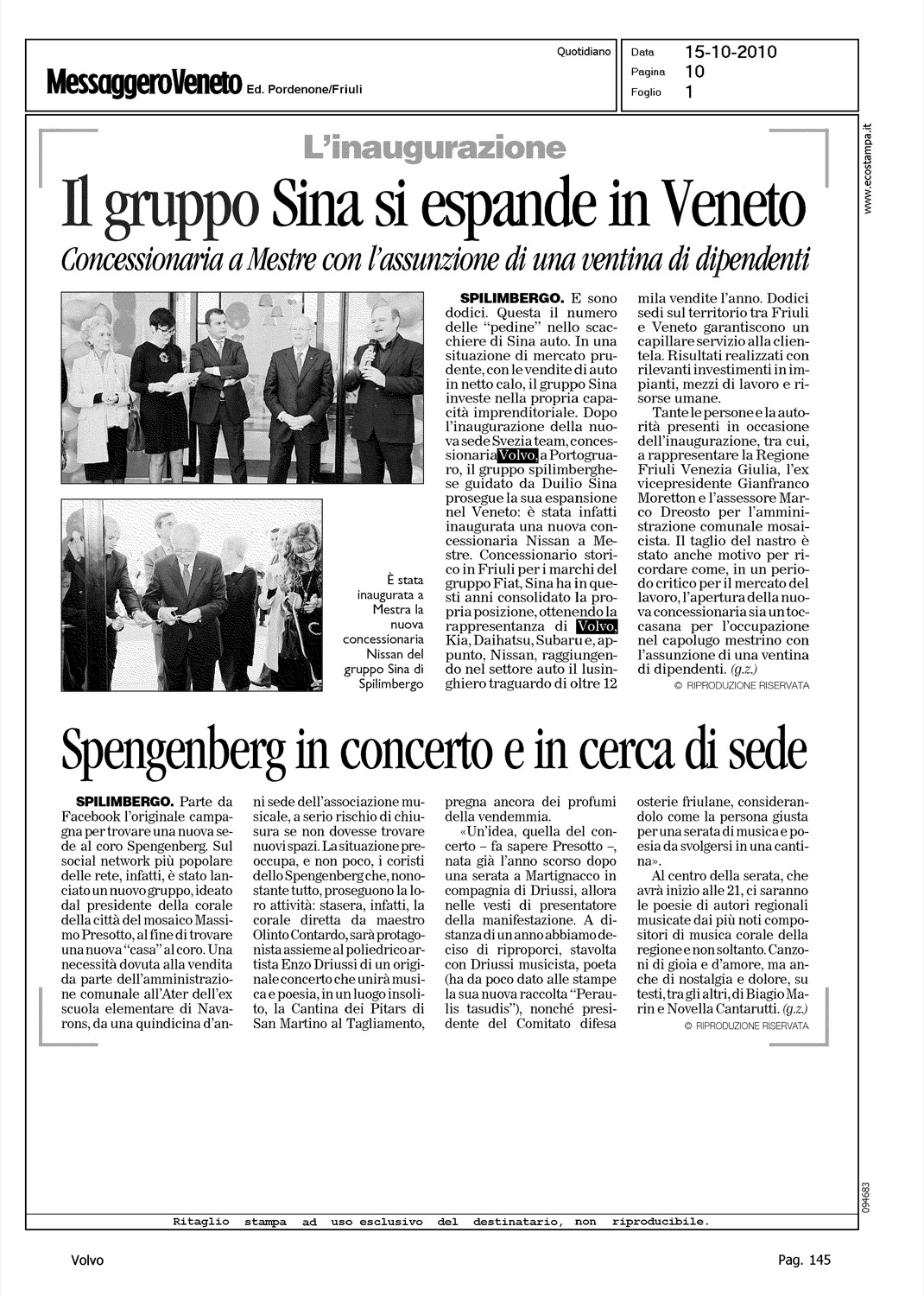 Author: Line: Corporate Model: Corporate Subject: - Title: IL GRUPPO SINA SI ESPANDE IN VENETOHighlight: (EDIZIONE PORDENONE) - SVEZIA TEAM - CONCESSIONARIA VOLVO PORTOGRUARO - GRUPPO SINA
