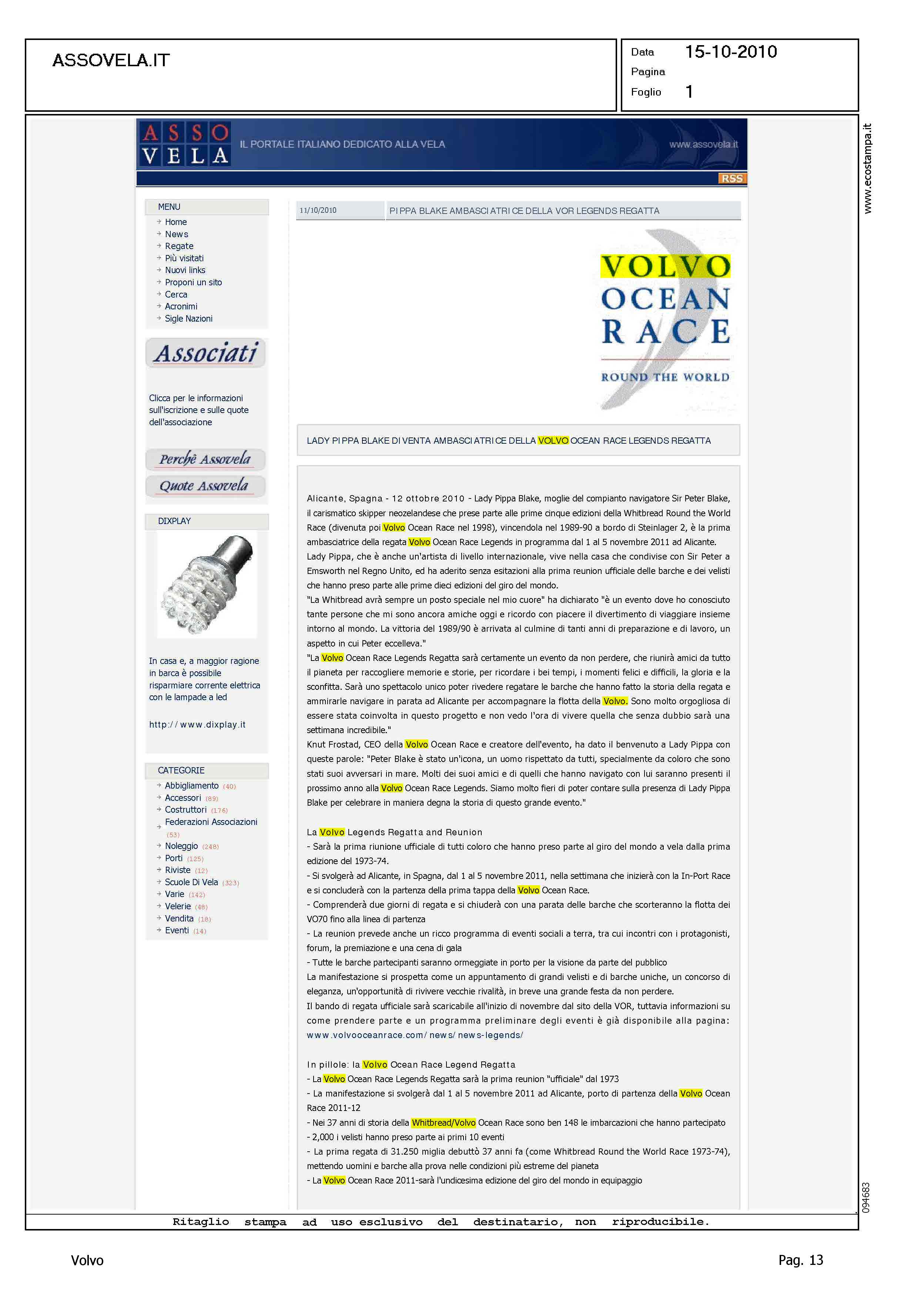Author: Line: Corporate Model: Corporate Subject: Volvo Ocean Race Title: LADY PIPPA BLAKE DIVENTA AMBASCIATRICE DELLA VOLVO OCEAN RACE LEGENDS REGATTAHighlight: REGATA 2011-12 - LEGENDS REGATTA