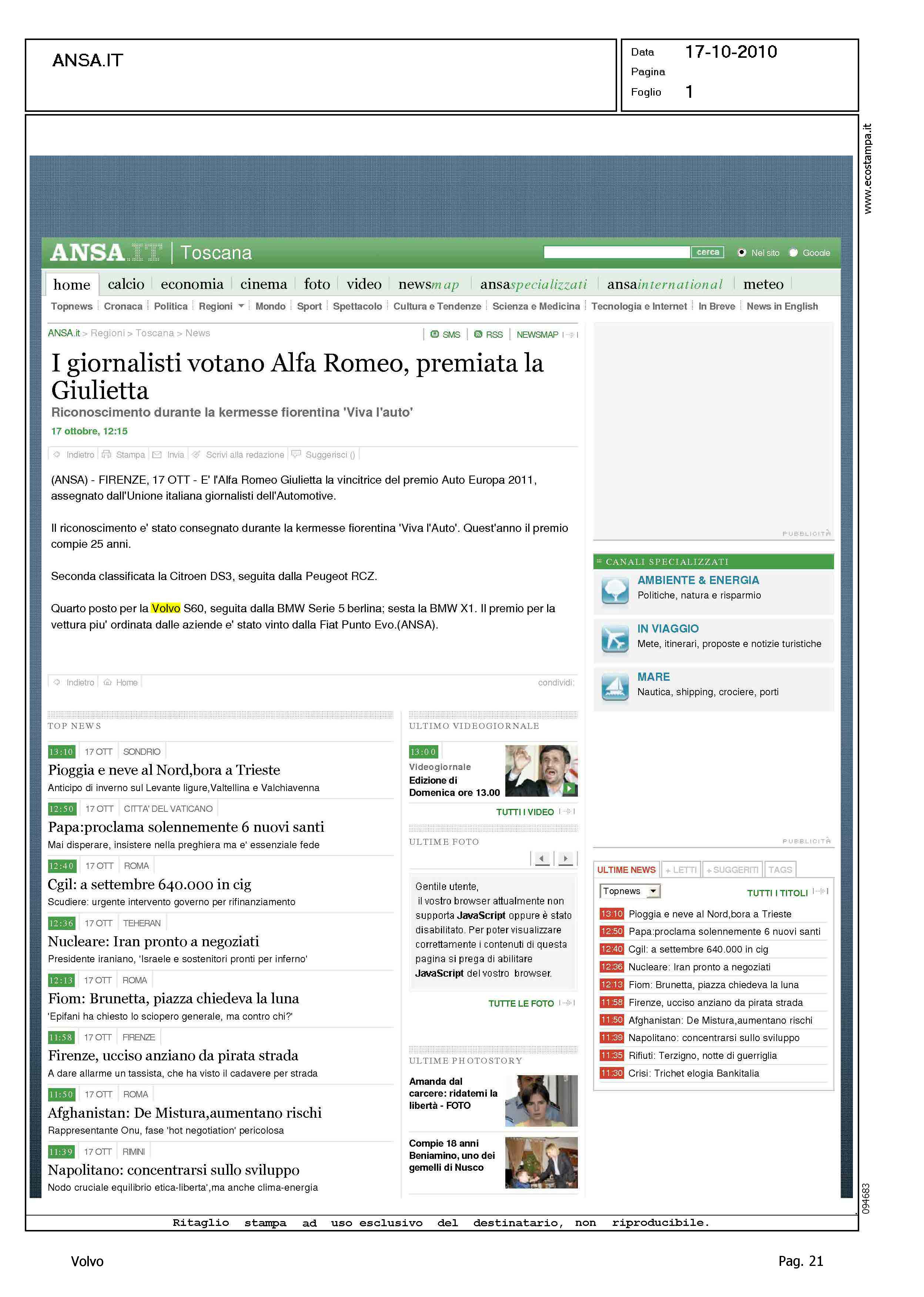 Author: Line: Corporate Model: Corporate Subject: - Title: I GIORNALISTI VOTANO ALFA ROMEO, PREMIATA LA GIULIETTAHighlight: UIGA - AUTO EUROPA 2011 - VOLVO S60 - POSIZIONE VOLVO, 4°