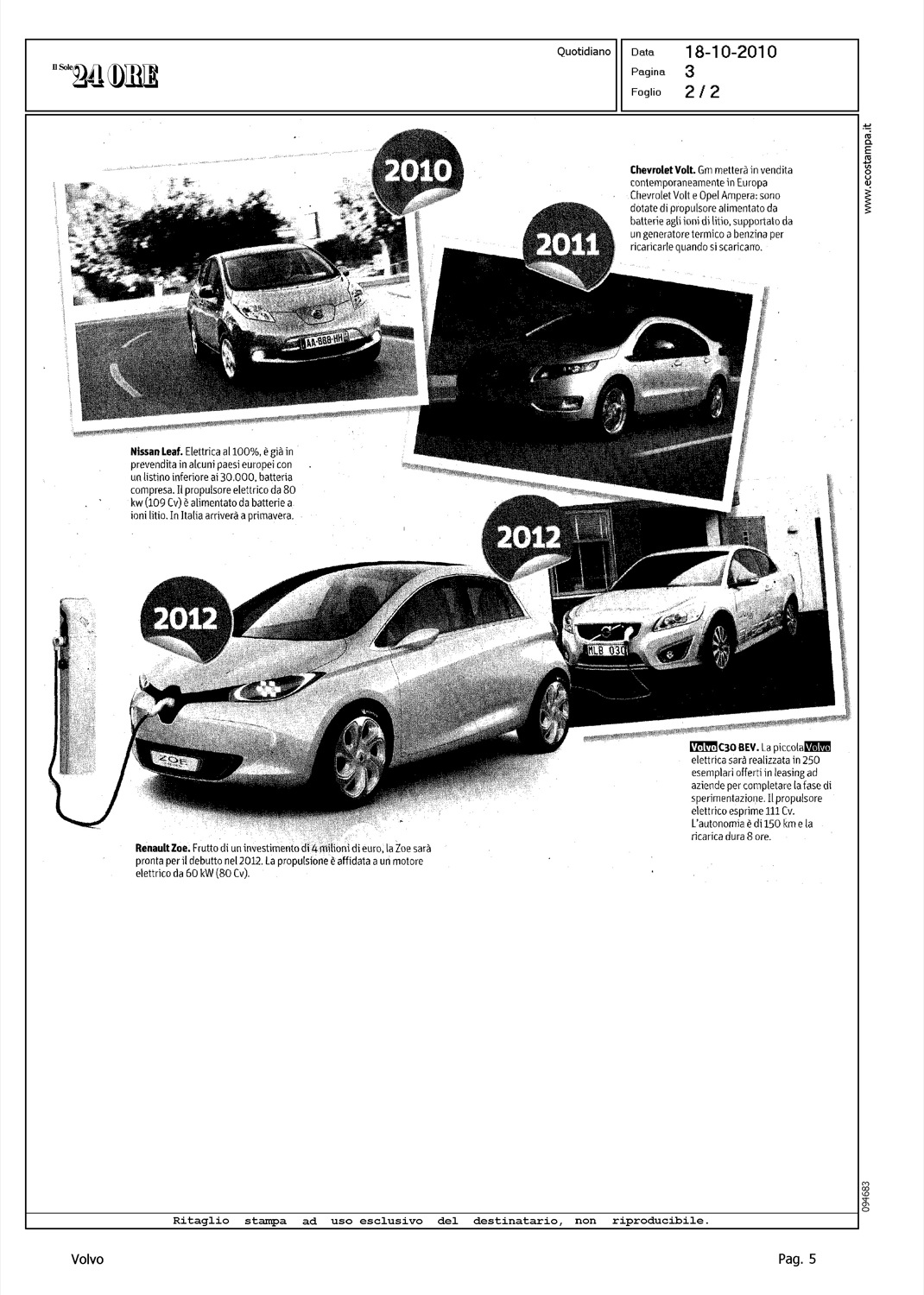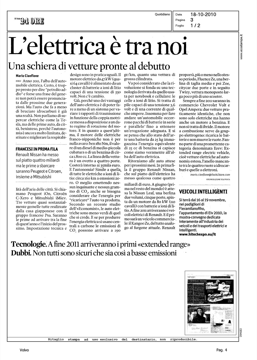 Author: CIANFLONE, MARIOLine: Corporate Model: Volvo C30 Subject: - Title: L'ELETTRICA E' TRA NOIHighlight: FLOTTA TEST 250 ESEMPLARI - LEASING - POTENZA - AUTONOMIA - RICARICA