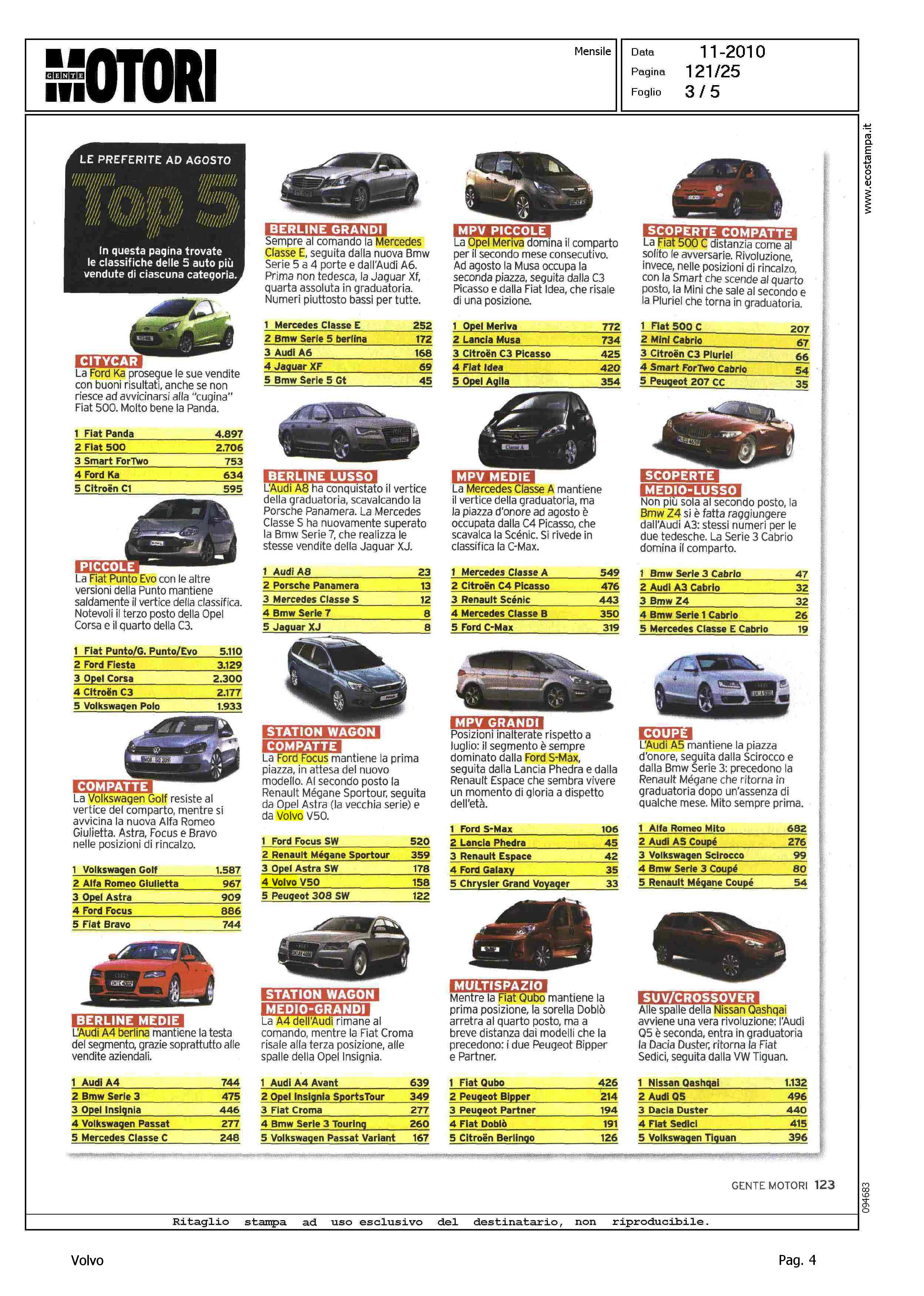 Title: MERCATO - AUTOMOBILI NAZIONALI - L'ITALIA S'ARRESTA - LE PREFERITE DI AGOSTO - IN RAMPA DI LANCIO, V60: ARRIVA LA STATION DELLA VOLVO